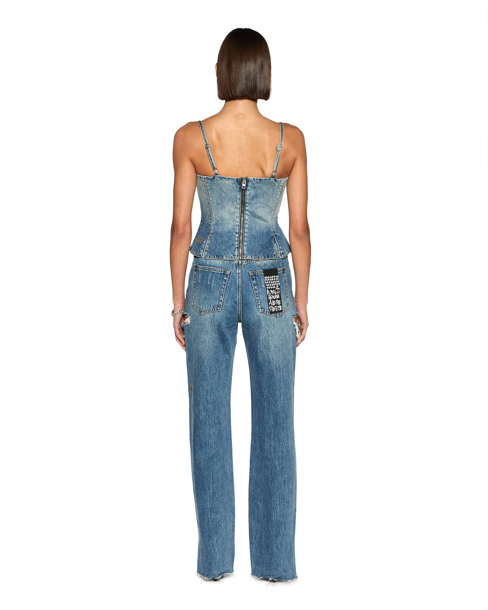 The Athena Bustier Aged is a fitted panelled bustier with scoop neck rouleau straps and a back zipper closure. Featuring light sanding on the front of the top with underwire bust cups. and anti-silver branded zipper panel shaping.