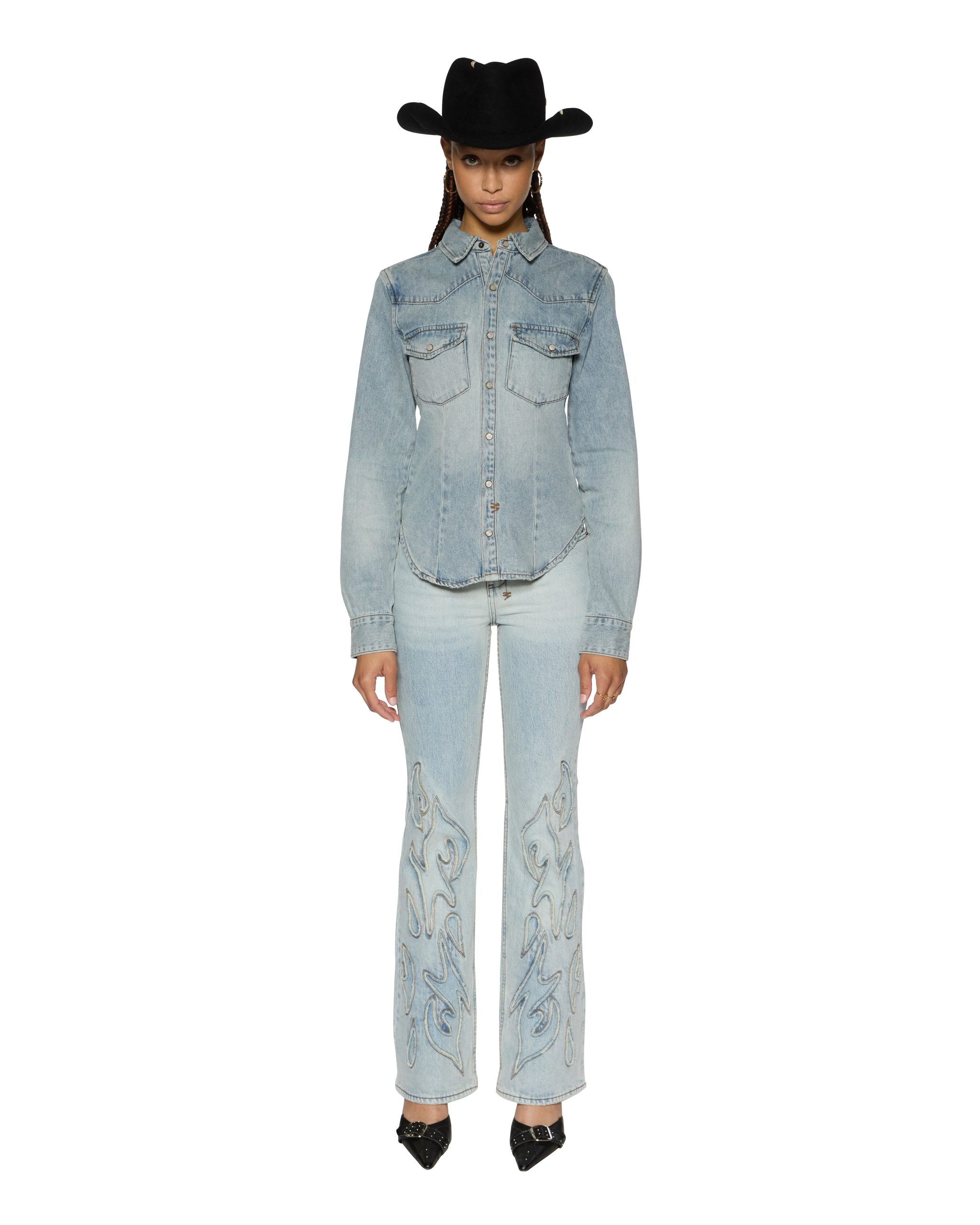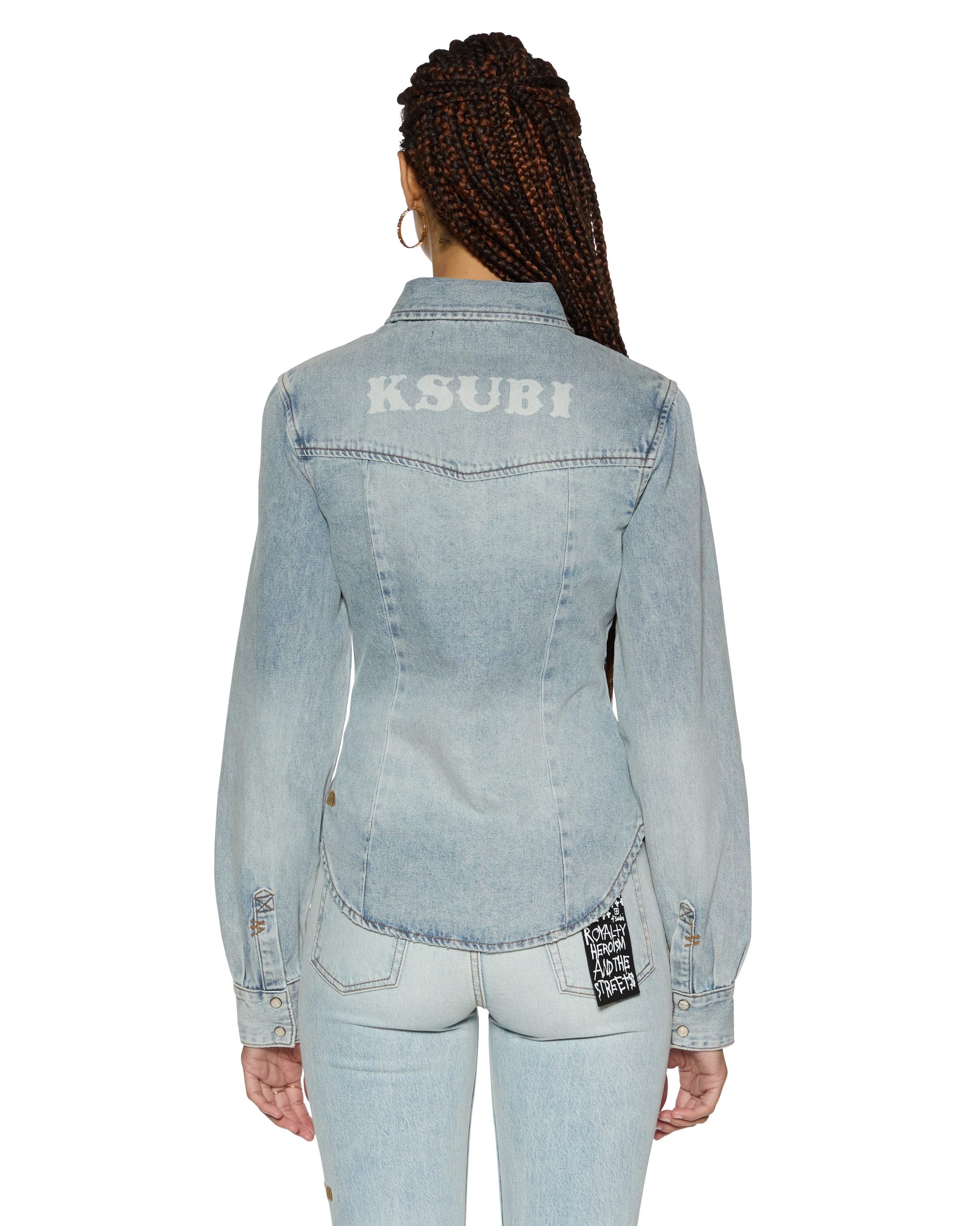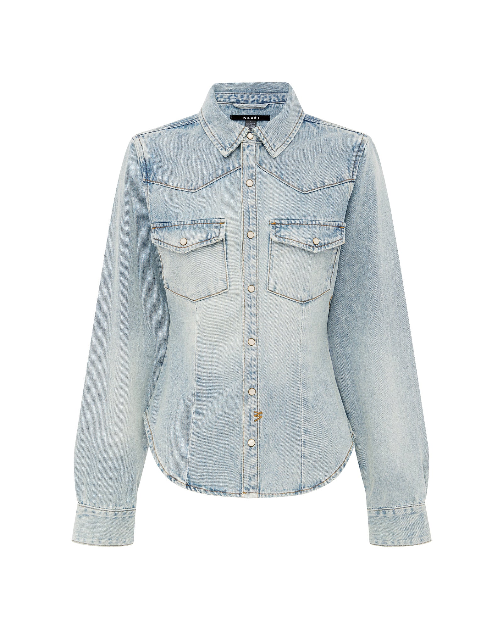 The Bella Long Sleeve Shirt Paragon is a slim-fit. button-up shirt made from stone-washed rigid denim. It features western style front pockets and western shaped yokes. Snap buttons are located on the sleeve openings.
