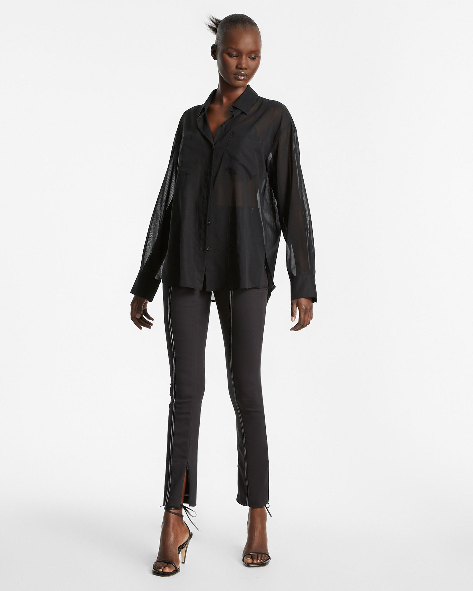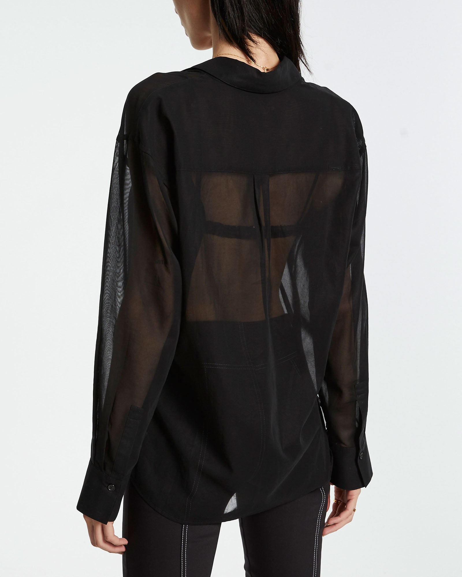 The Cher Shirt is a classic black collared shirt. with long sleeves and a curved hem. in a relaxed fit. Made from a premium cotton voile for a soft hand feel.