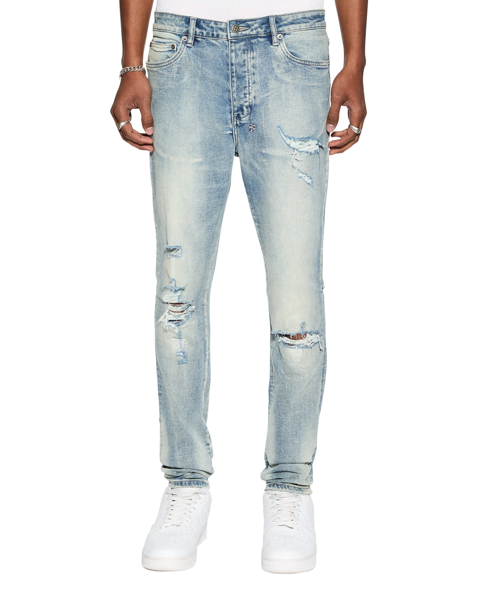 The Chitch Punk Blue Thrashed is a mid rise. slim fit. tapered denim jean featured in a blue wash colourway with worn-in highlights. Constructed from European comfort cotton stretch denim. this jean is detailed with heavy rips and repairs. This style features a 5 pocket design with the signature 4×4 detailing. button fly and removable back pocket tag.