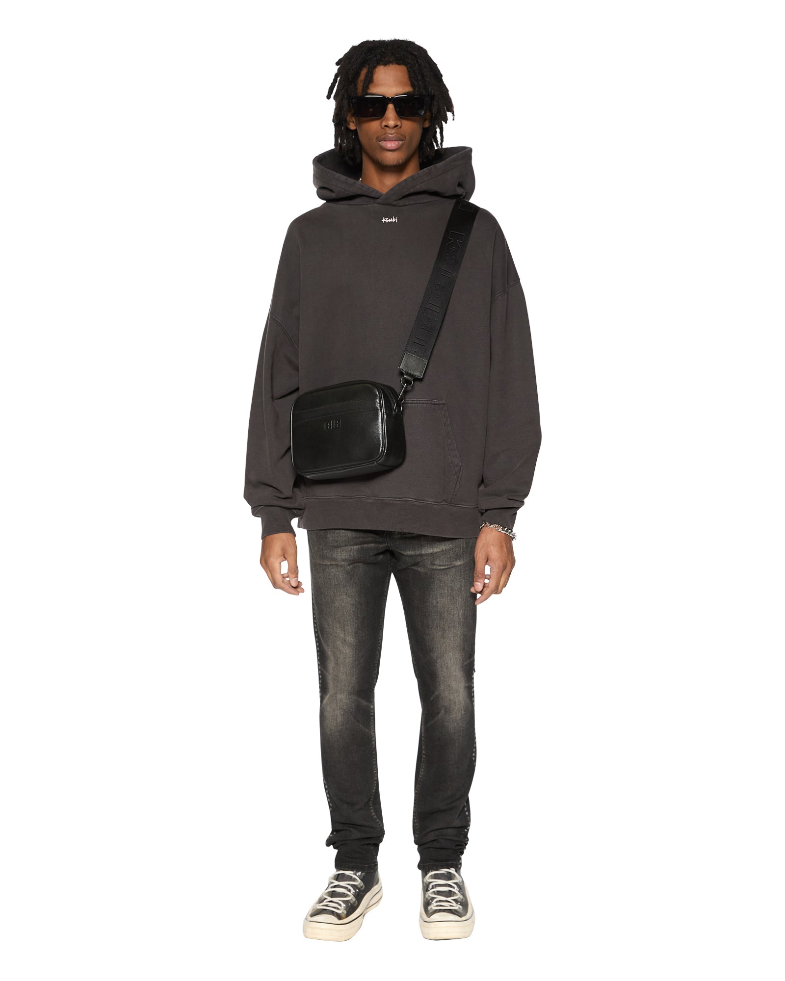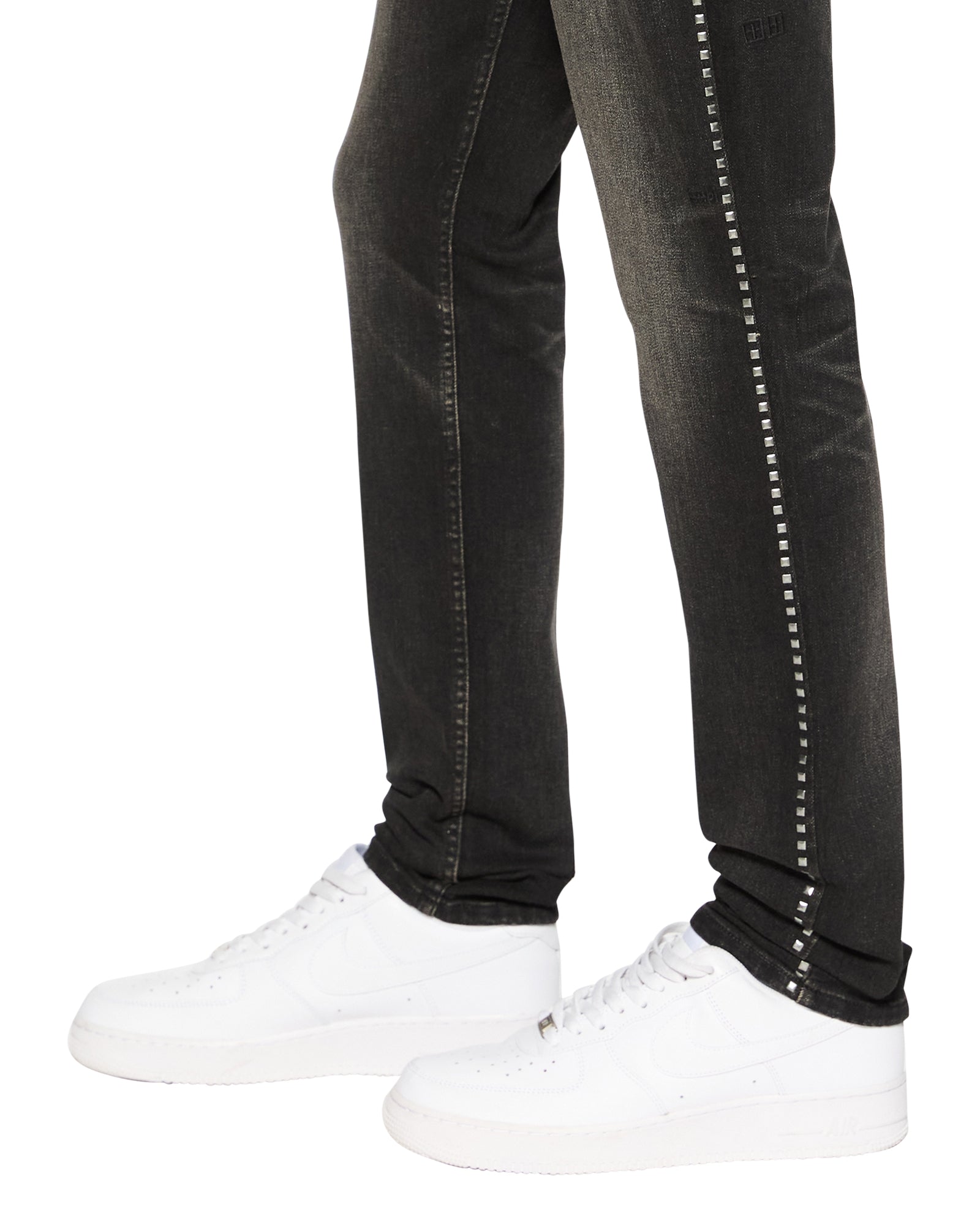 The Chitch Tarr Studded is a slim tapered jean made from European comfort stretch black denim with a vintage stone wash. Featuring square metal studded details along the side seam and an unfinished hem. Finished with signature T-box embroidery. 4×4 hotfix application. and Ksubi branded hardware.