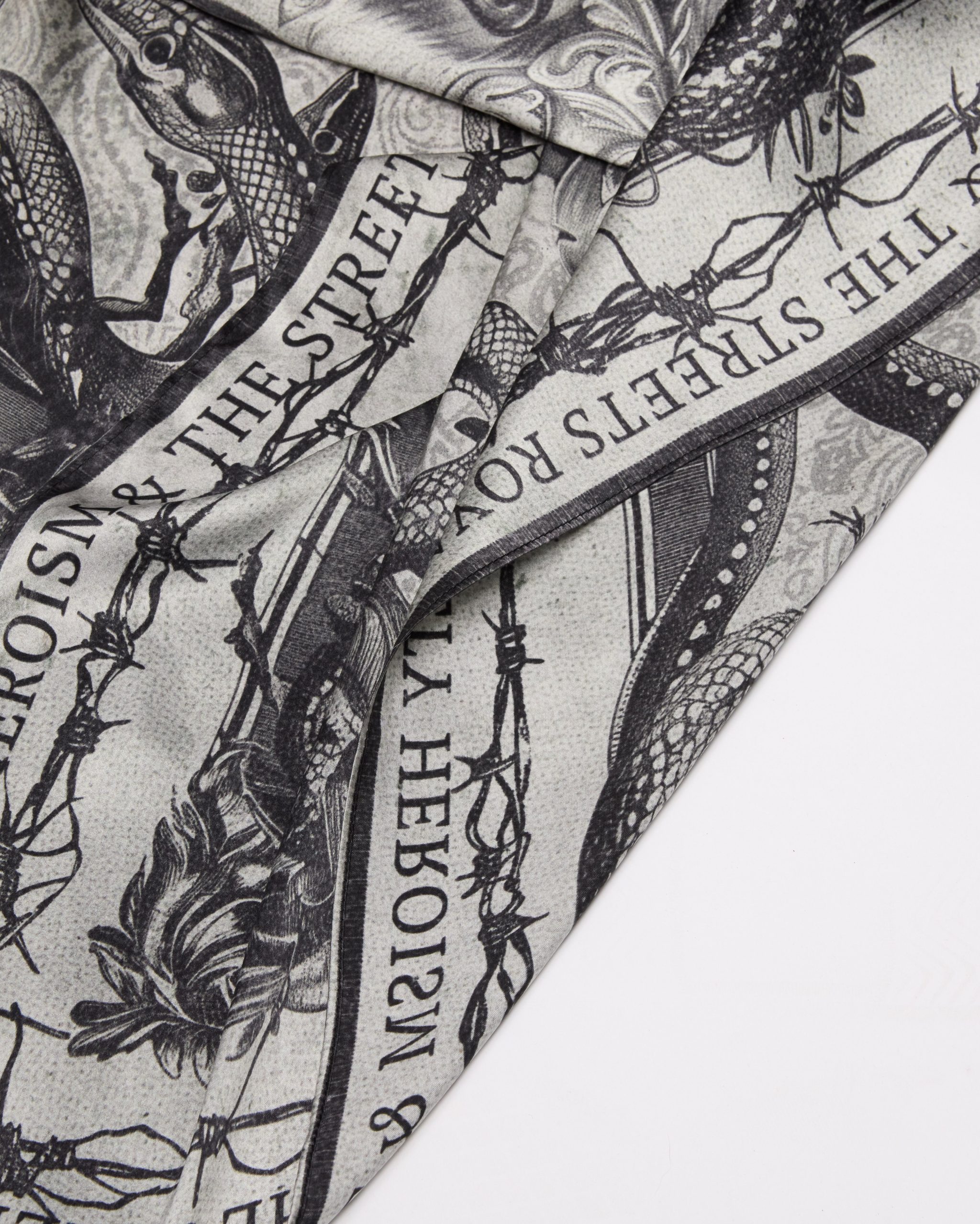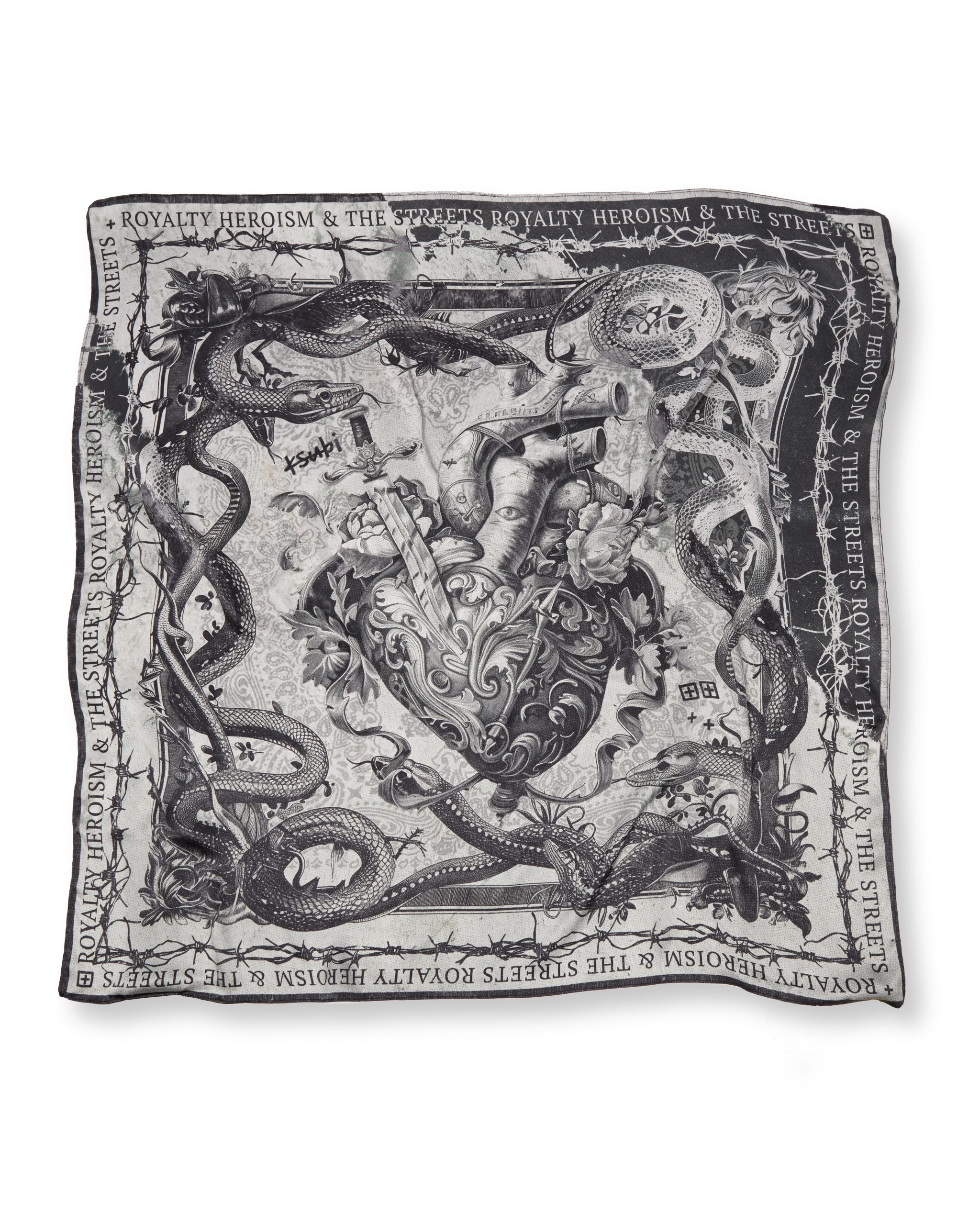 Digitally printed square silk scarf featuring a motif of classic Ksubi iconography and branding. Designed to be worn as a top. printed on 100% silk