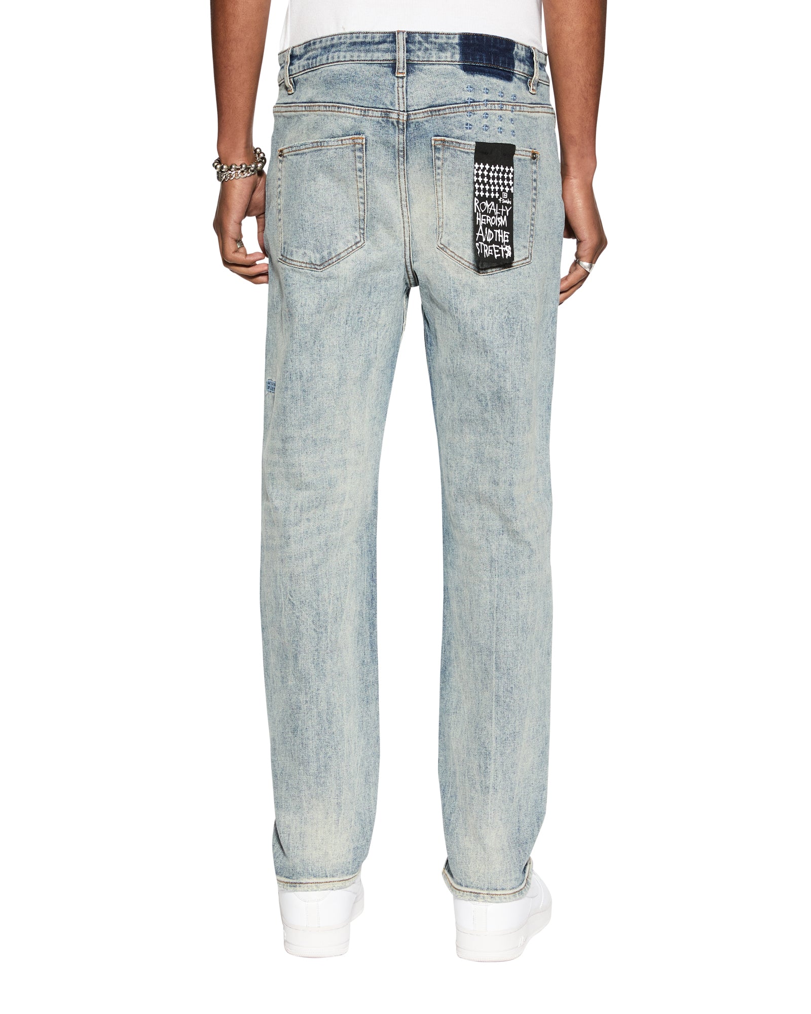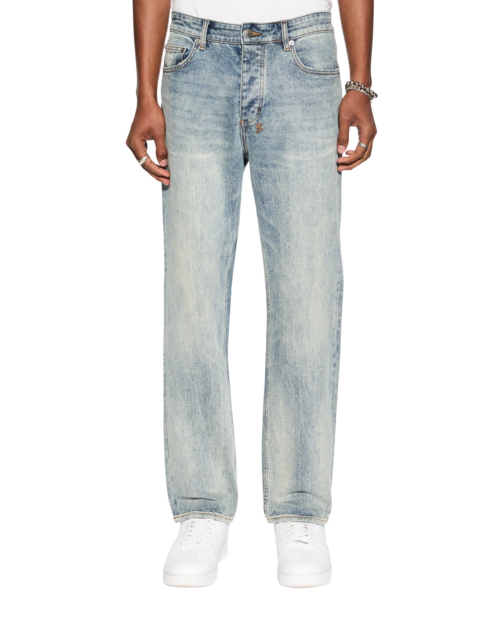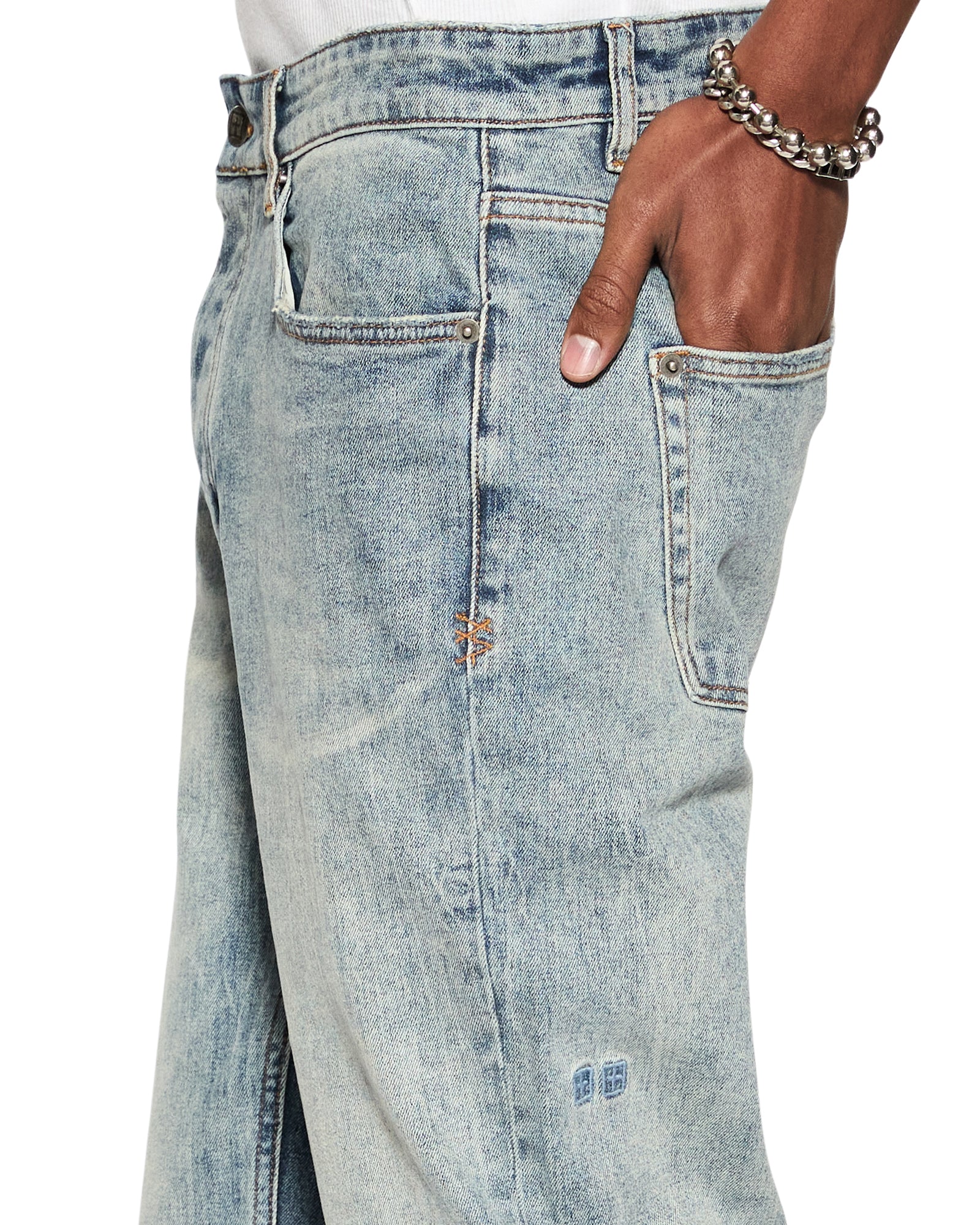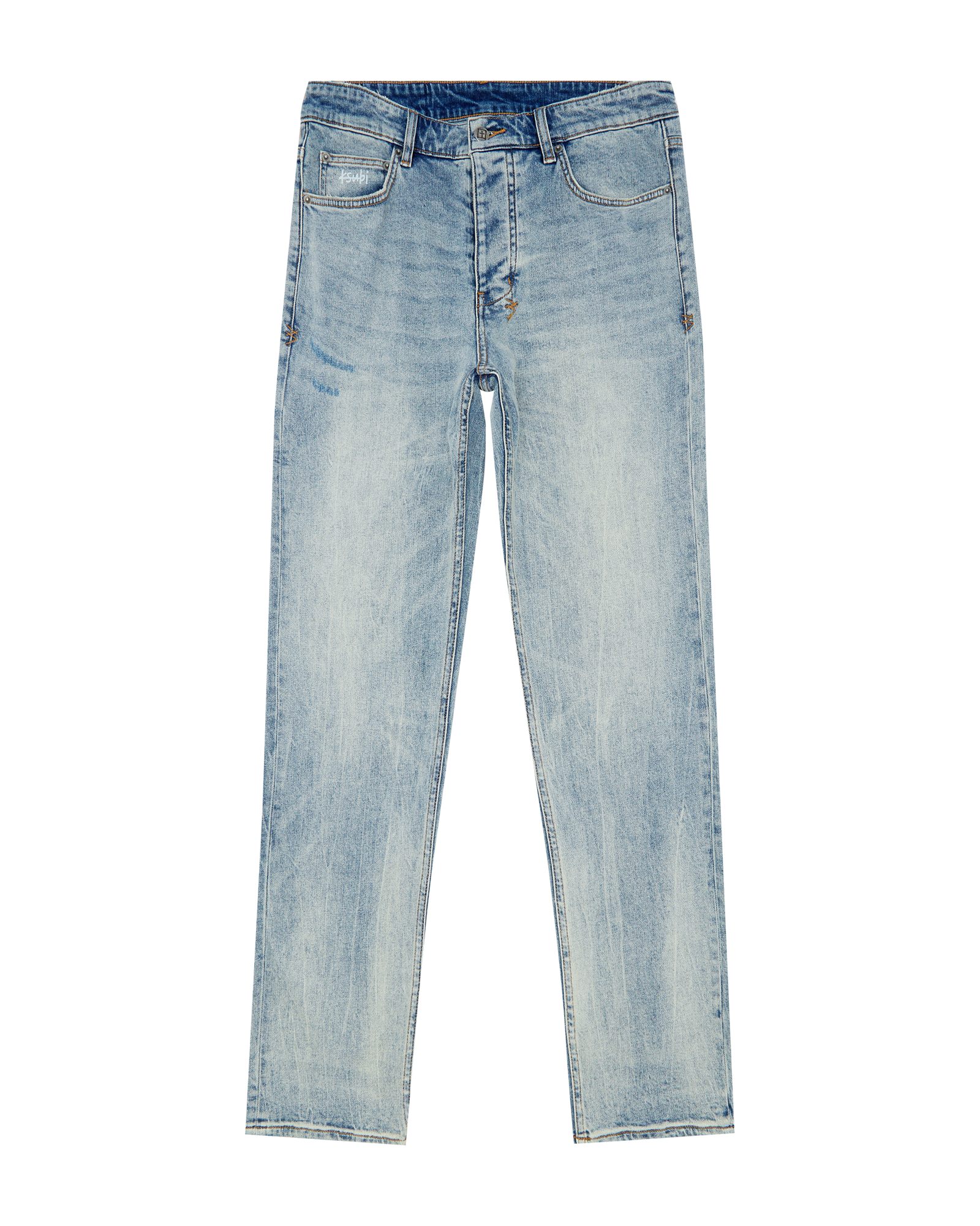 The Hazlow Stairway is a mid-rise. relaxed straight-fit jean with a regular leg opening. crafted from premium rigid indigo denim with a heavy blue marbled stone wash. It is finished with signature t-box and 4×4 embroidery. ghost patching detailing. and Ksubi branded hardware.