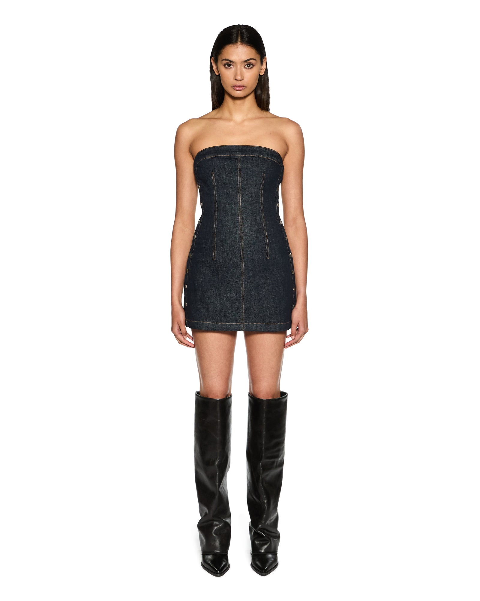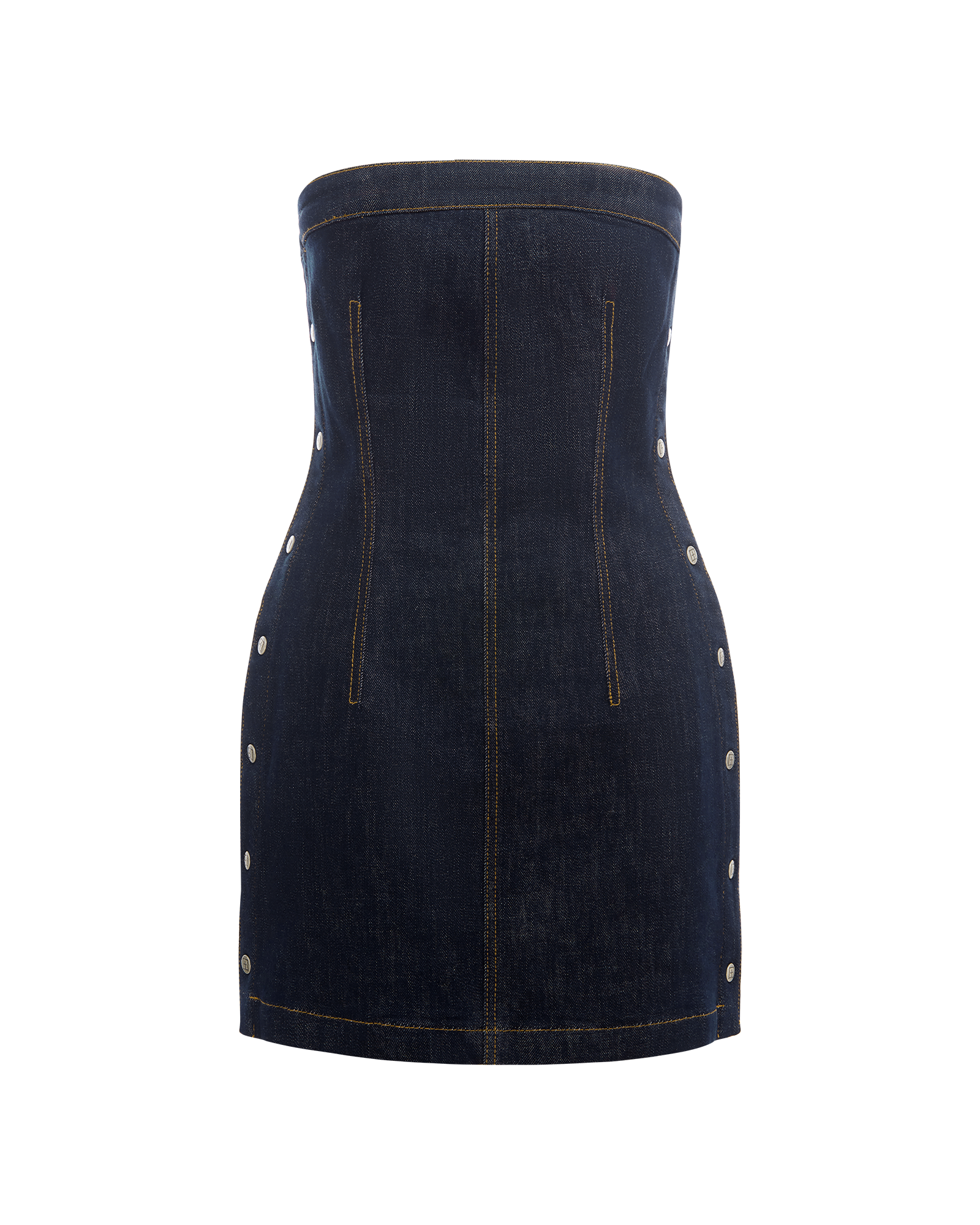 The Hotline Dress Original Snaps is a fitted strapless bustier mini dress. It has an exposed centre back zipper and snaps that open along the side seams. from the hem to the waist. to allow for layering over jeans.