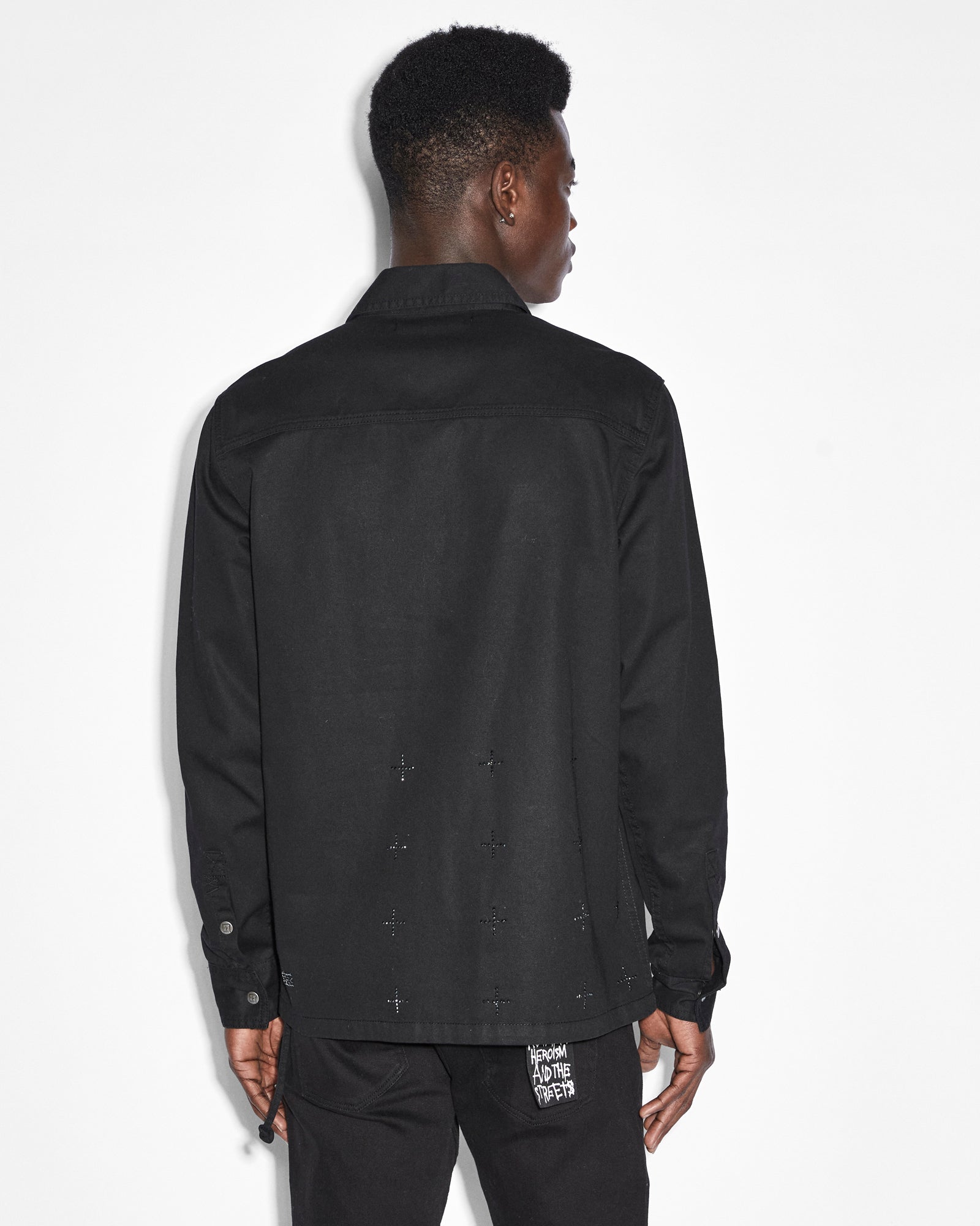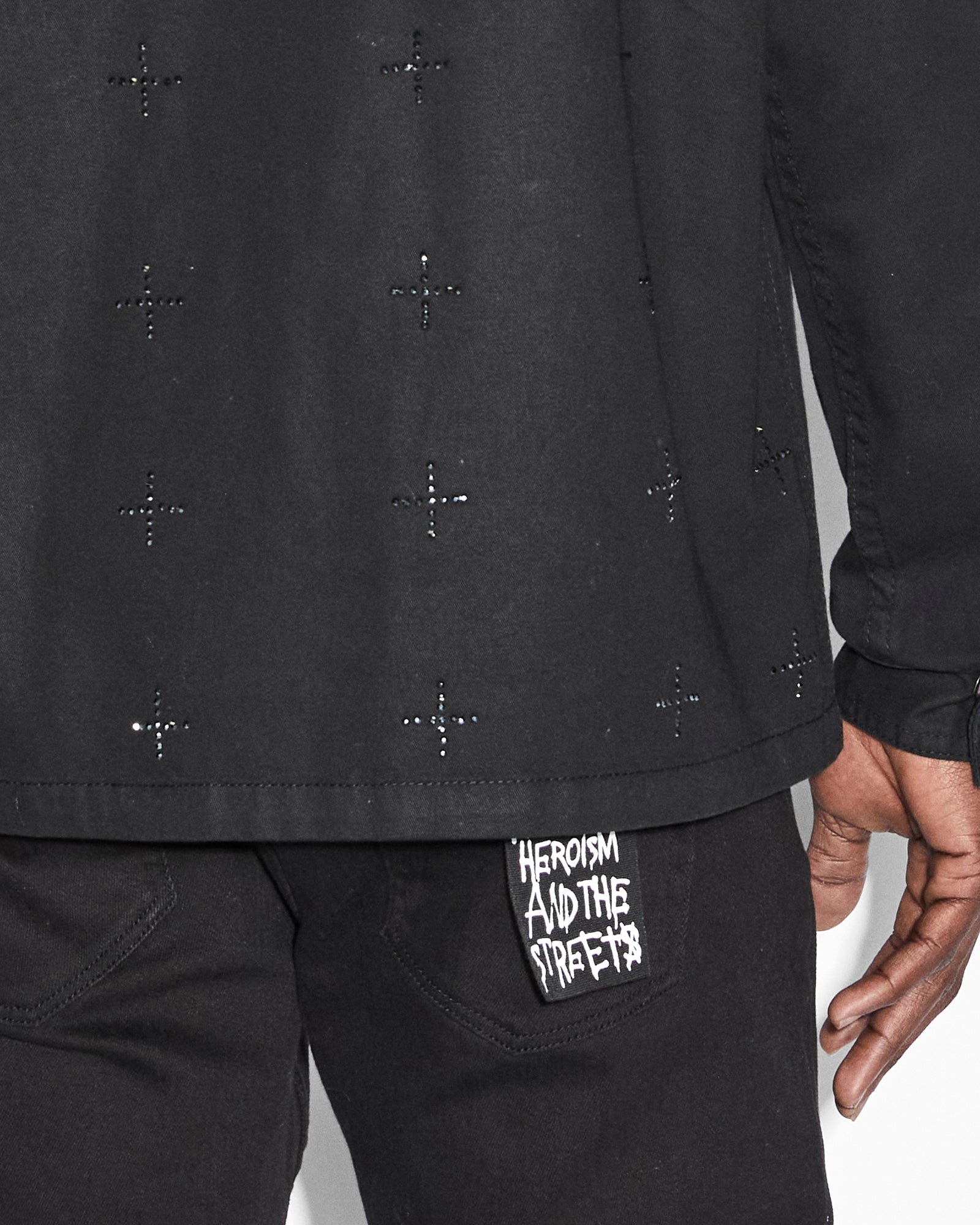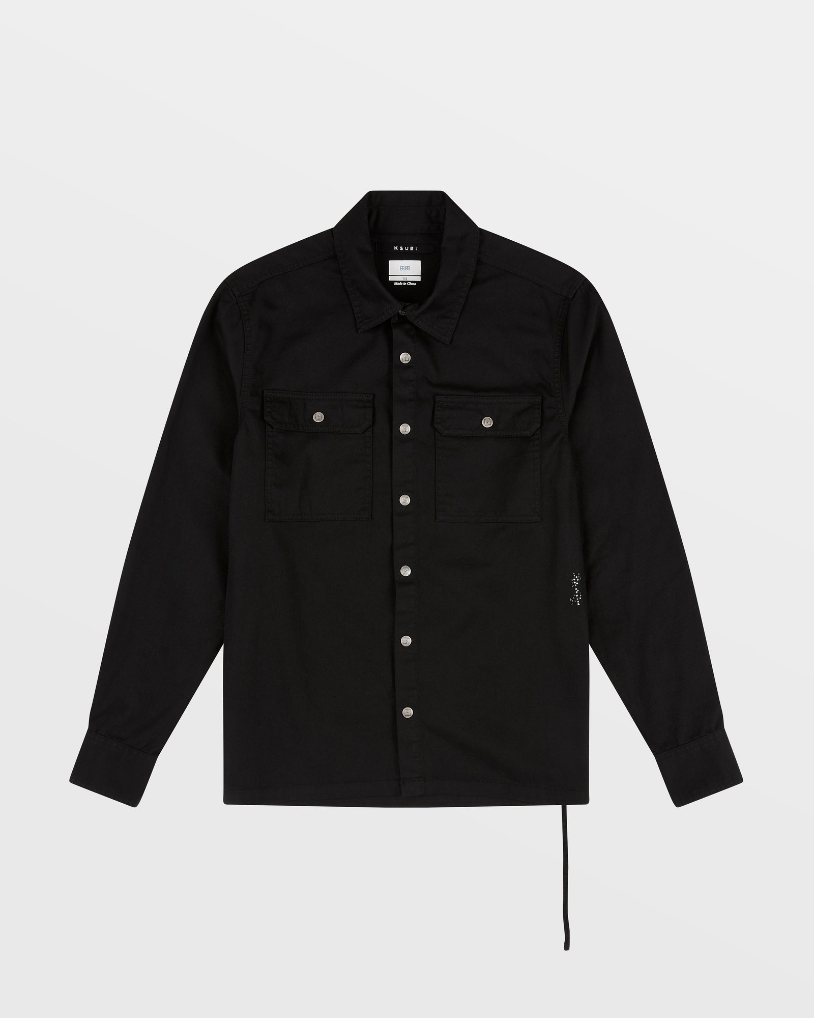 The Krystal Paradox Ls Shirt Black is a button through. long sleeved shirt featuring a cross dollar. large 4×4 crosses on the back and Ksubi t-box�all executed with diamante crystals. This is a fitted style with chest patch pockets made from premium rigid cotton shirting in a black colourway. Pair with the ‘Chitch Krystal’ for a matching set.