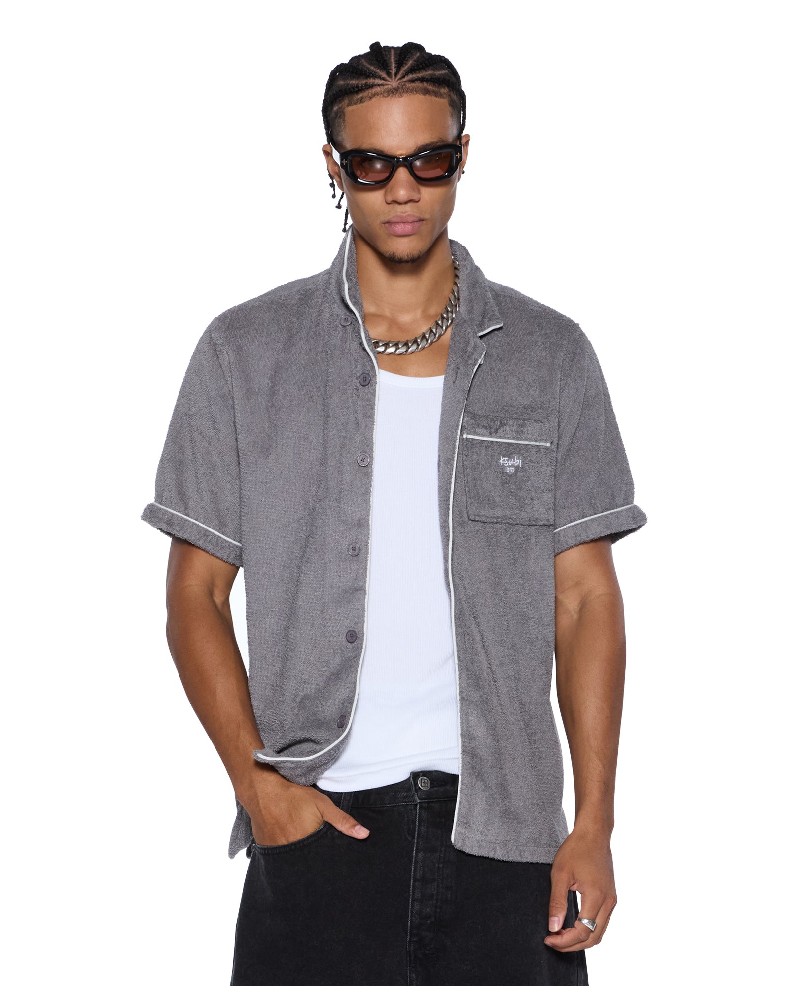 The Lounge SS Resort Shirt Charocal is a relaxed-fit short sleeve resort shirt made from premium terry towelling. Featuring white piping. premium branded buttons at the front closure. and signature Ksubi t-box printed branding. this shirt combines comfort and style for effortless wear.