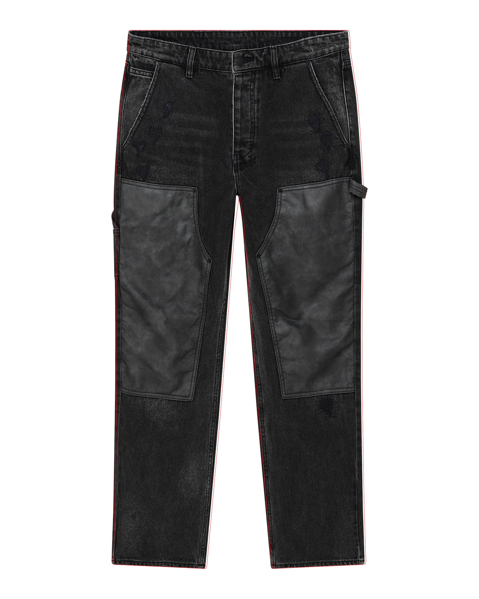 The Operator Pant Torqued Black is a mid-rise straight leg pant with carpenter panels. right leg carpenter’s pocket. tab cut-away pockets. and back patch pockets. Made from black rigid denim with faux leather paneling. it features leather aging treatments. oil blotch details. and denim aged washing. Finished with signature t-box and 4×4 embroidery. ghost patching detailing. and Ksubi branded hardware.