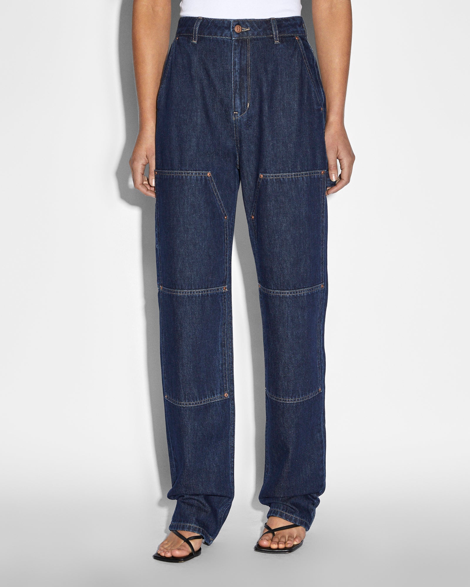 The Playback Carpenter Legacy are a relaxed tapered jean with a super high rise. This style features a front and back carpenter pocket detailing. along with a hammer loop. double front knee patches for added functionality. Made from premium lightweight rigid denim in the dark blue ‘legacy’ colourway. The jeans are detailed with copper-branded hardware. a contrast tobacco T-box. and 3×4 embroidery.