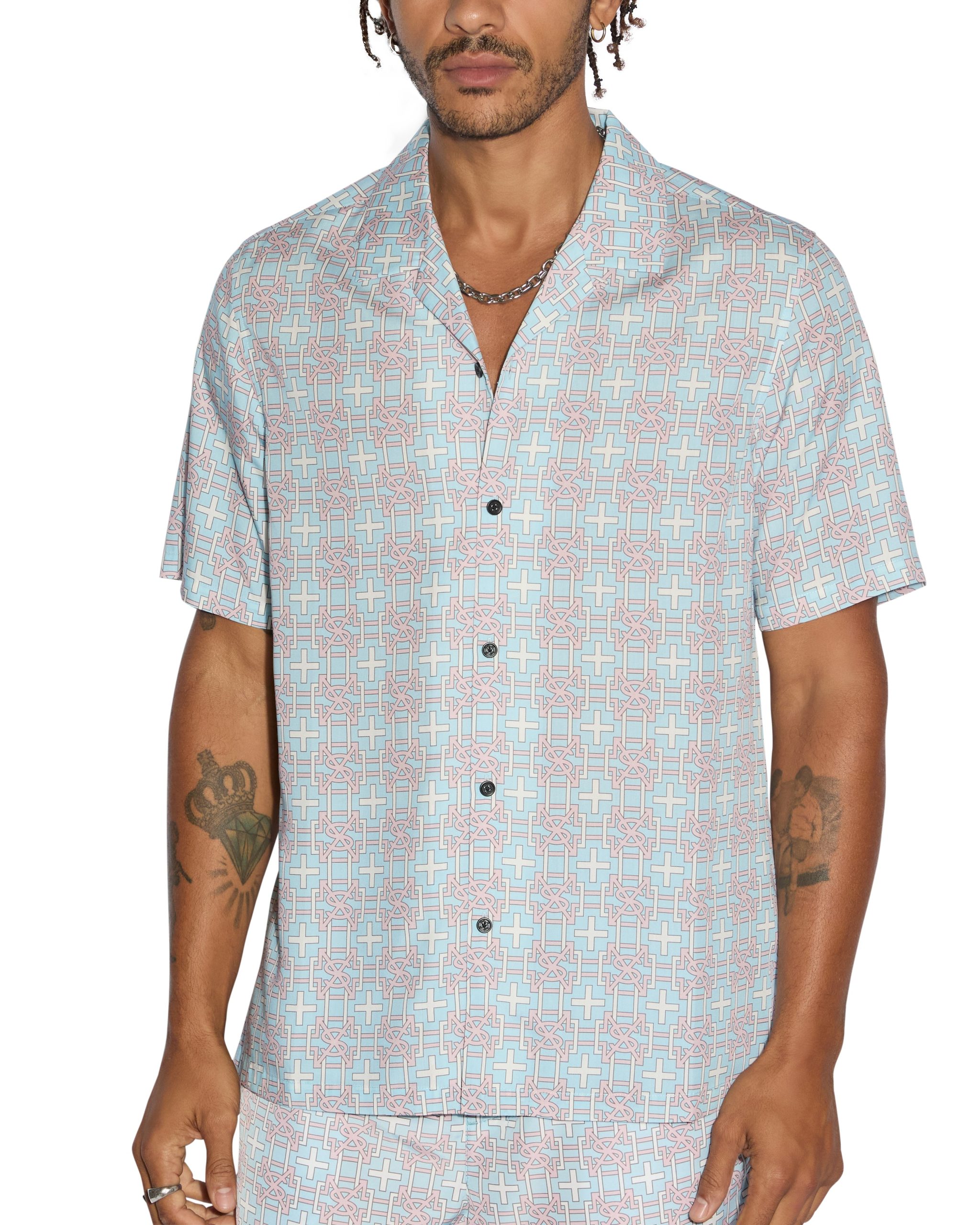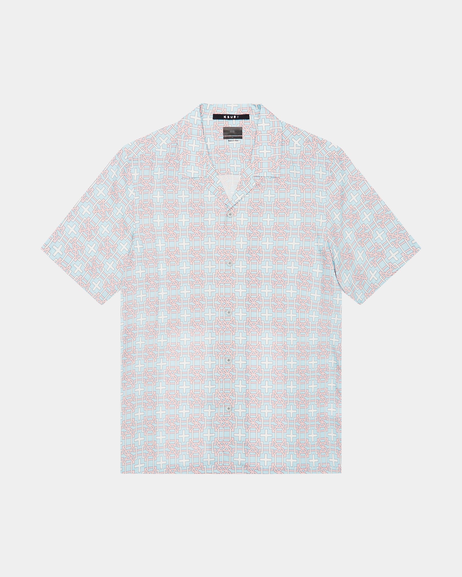 The Plus Resort Ss Shirt Paradise is made from a premium tencel fabric in a blue and pink original Ksubi plue print all over. This resort shirt has branded buttons at the front closure. a step hem and t-box branding.