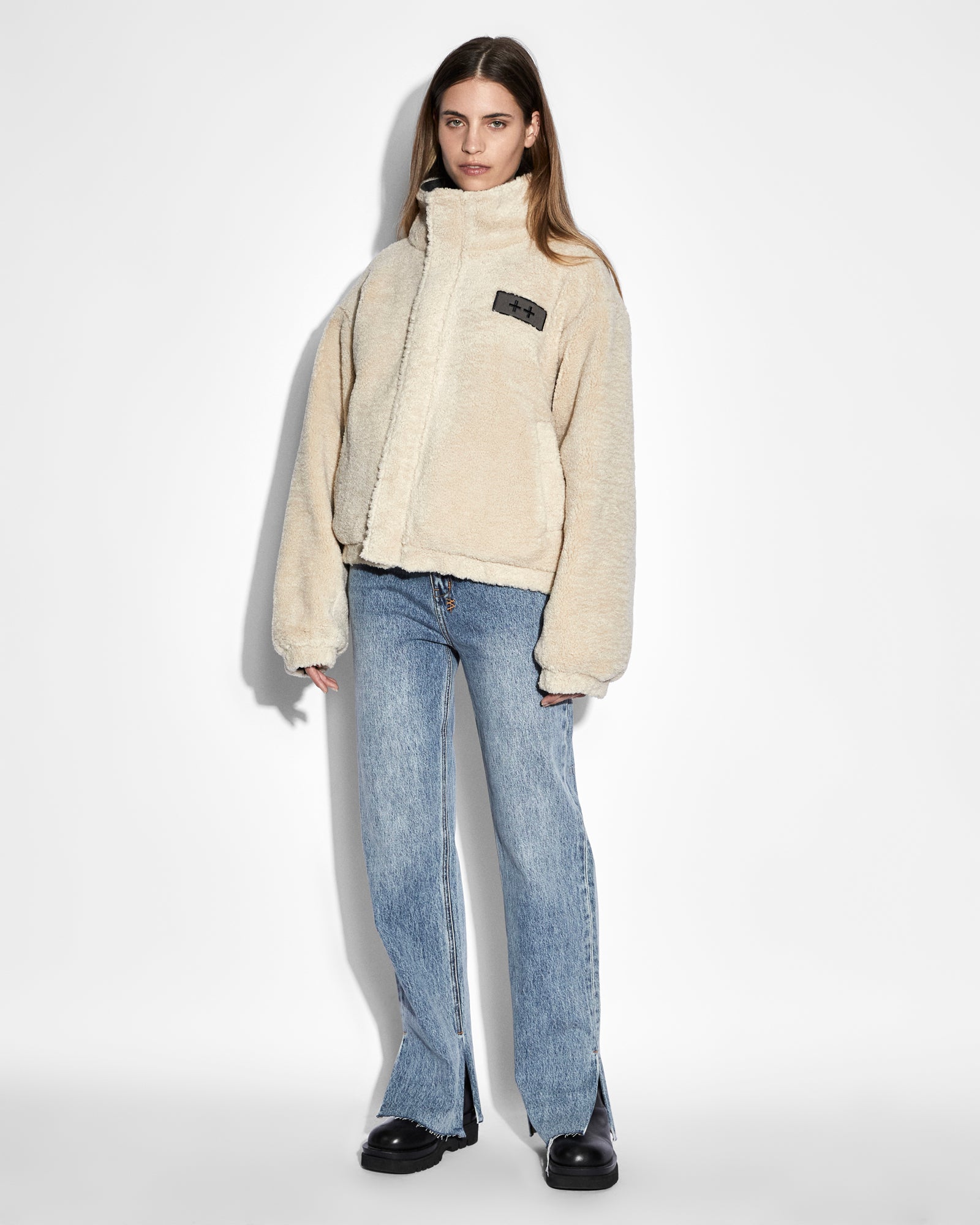 The Reversible Puffer Jacket Camo/Ecru is an oversized. zip through puffer jacket: one side is made from premium ripstop fabric with an exclusive camo print whilst the reverse side is an ecru fleece. This jacket is designed with a lightly padded body and sleeves featuring a Ksubi ‘Sign of The Times’ silicone logo print on the camo side and an embroidered logo patch on the ecru side.