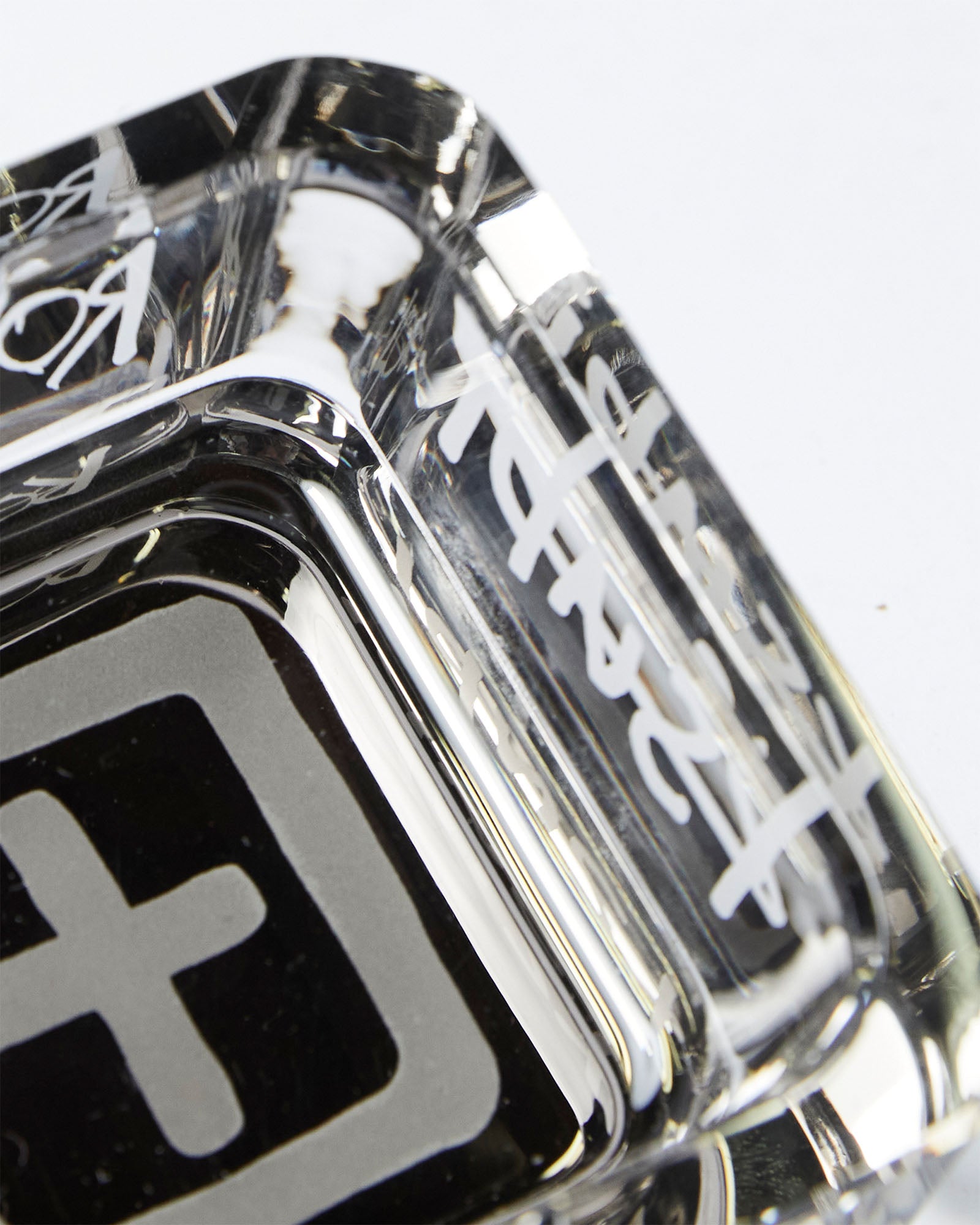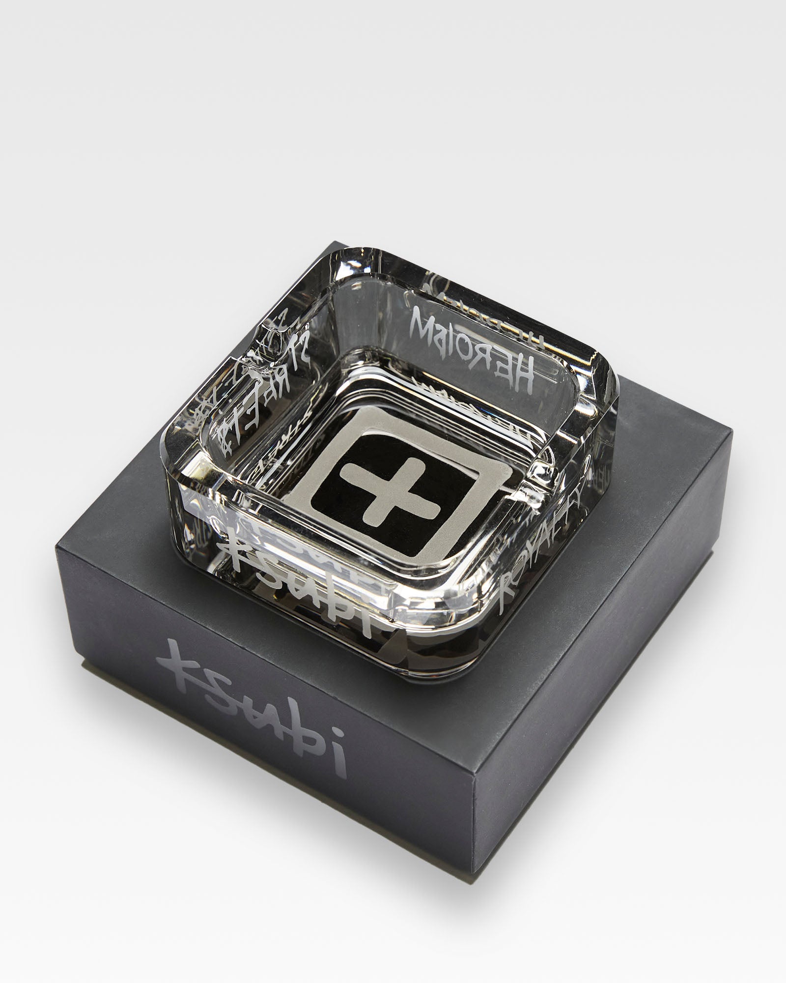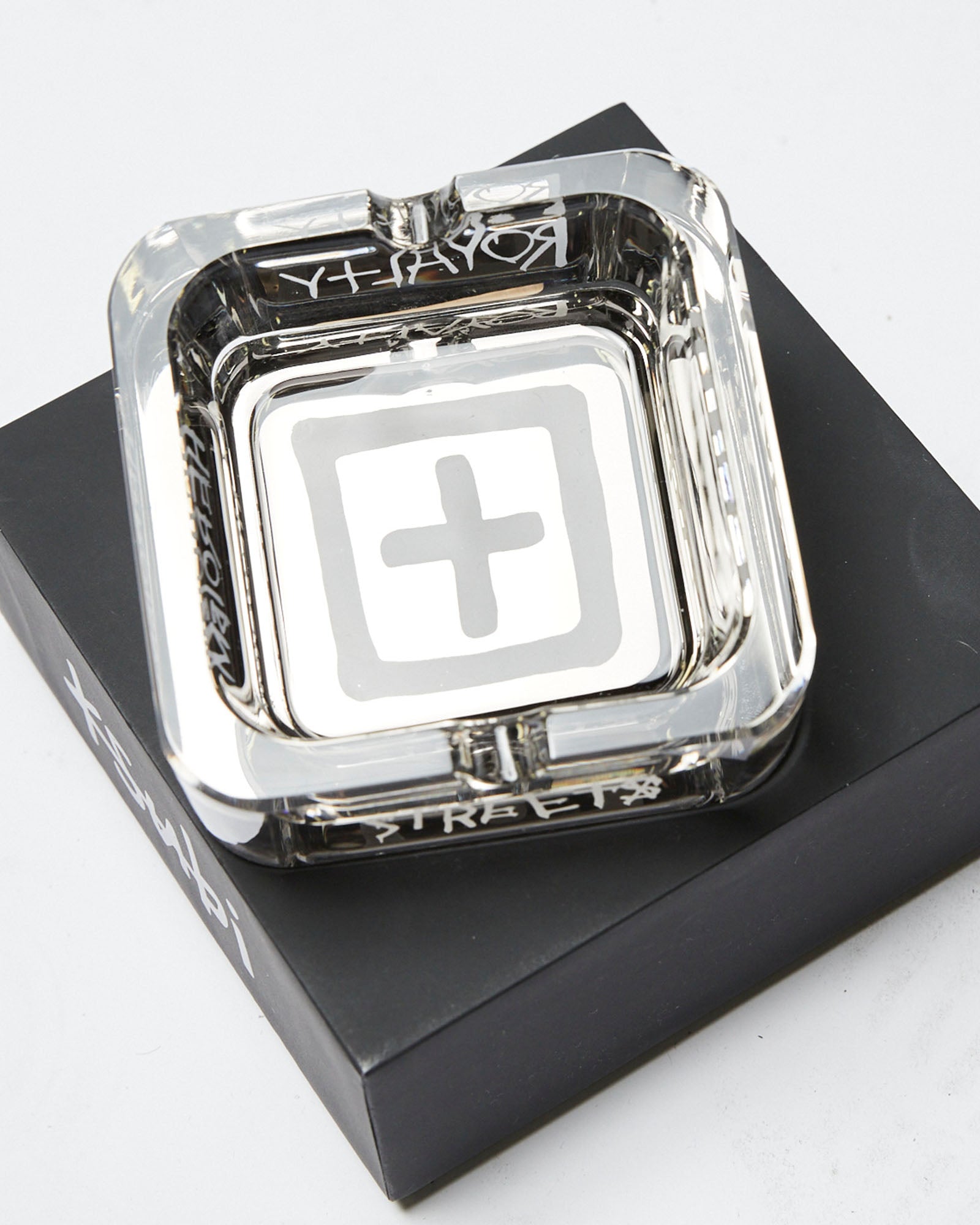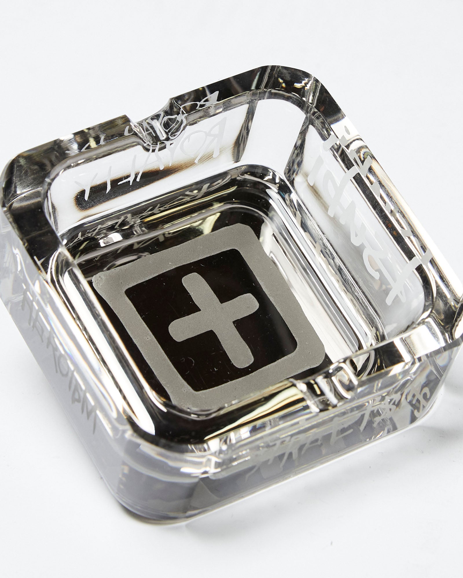 The Royalty Kashtray Grey is a 100% clear glass ashtray featuring a white t-box logo in the centre with a silver base. The Royalty. heroism and the streets text and Ksubi logo is engraved.