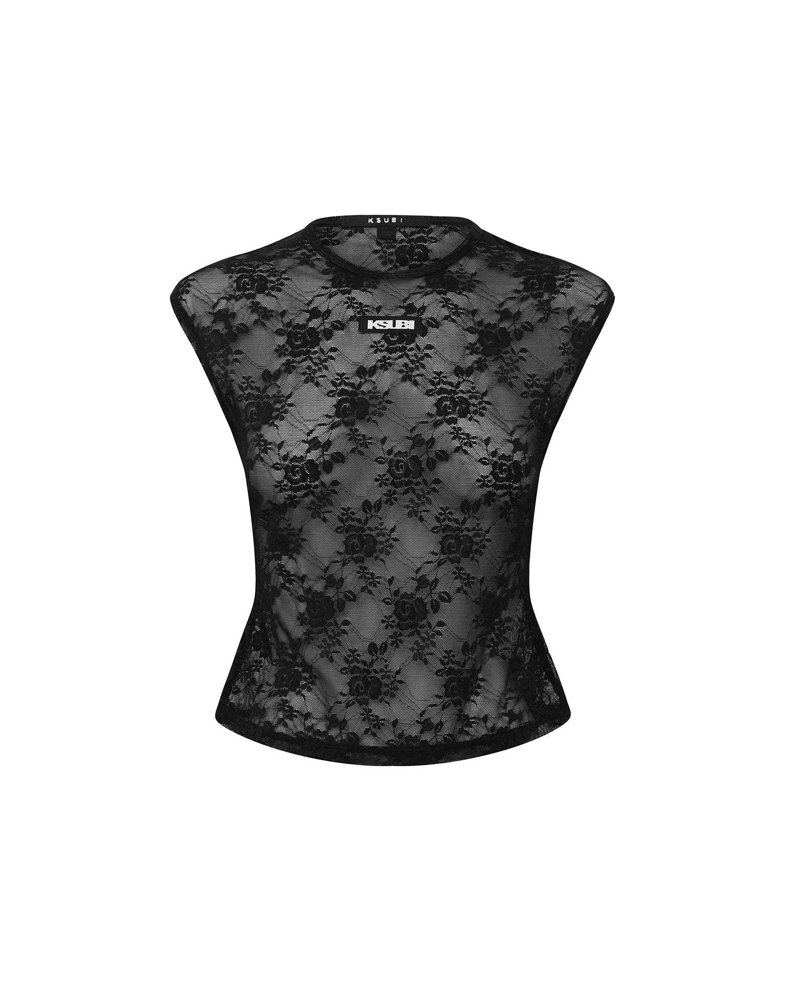 The Slim Tee Black Lace is a slim fit mock neck cap sleeve tee made from premium stretch lace. It features a floral motif and SOTT embroidery on the front chest. along with T-box embroidery.