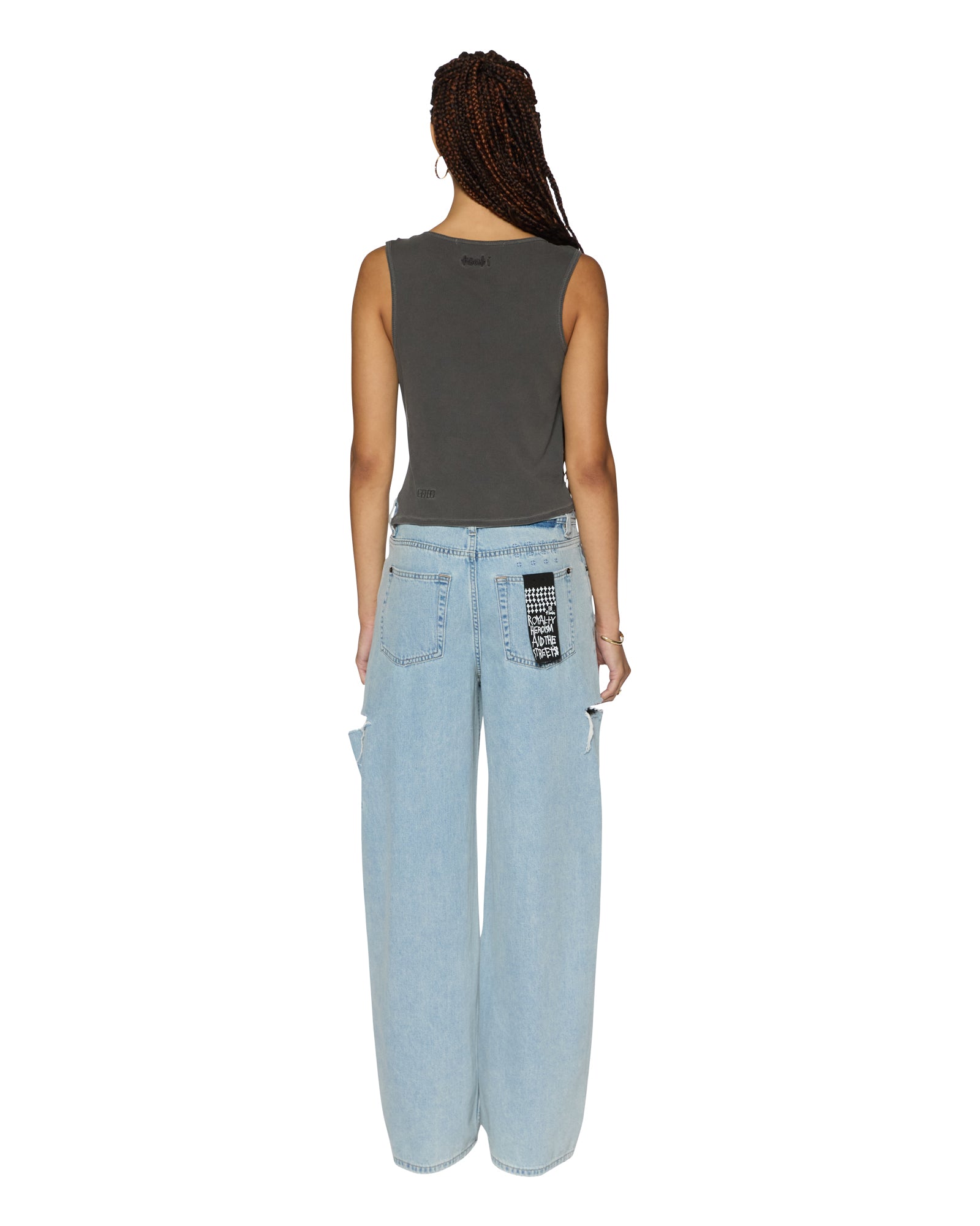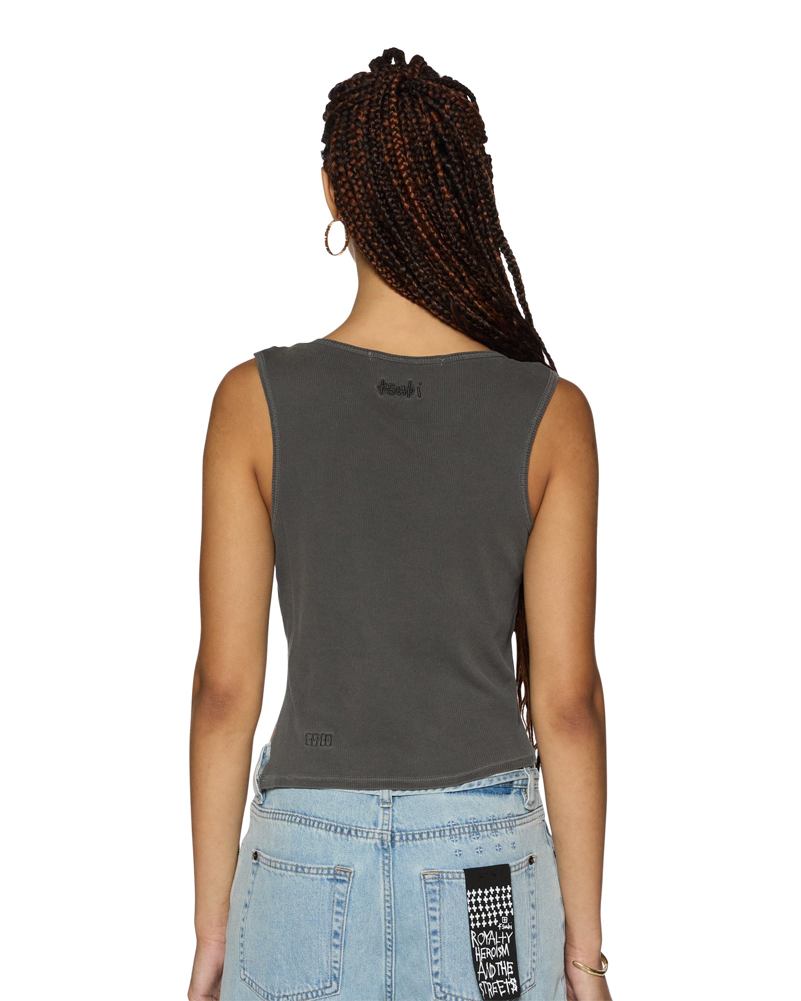 The Twisted Tank Charcoal is a full-length tank made from premium lightweight cotton rib in charcoal. It features a unique twisted detail on one shoulder. with a raw cut neckline and side seam split. Branding includes cross dollar and T-box embroidery.
