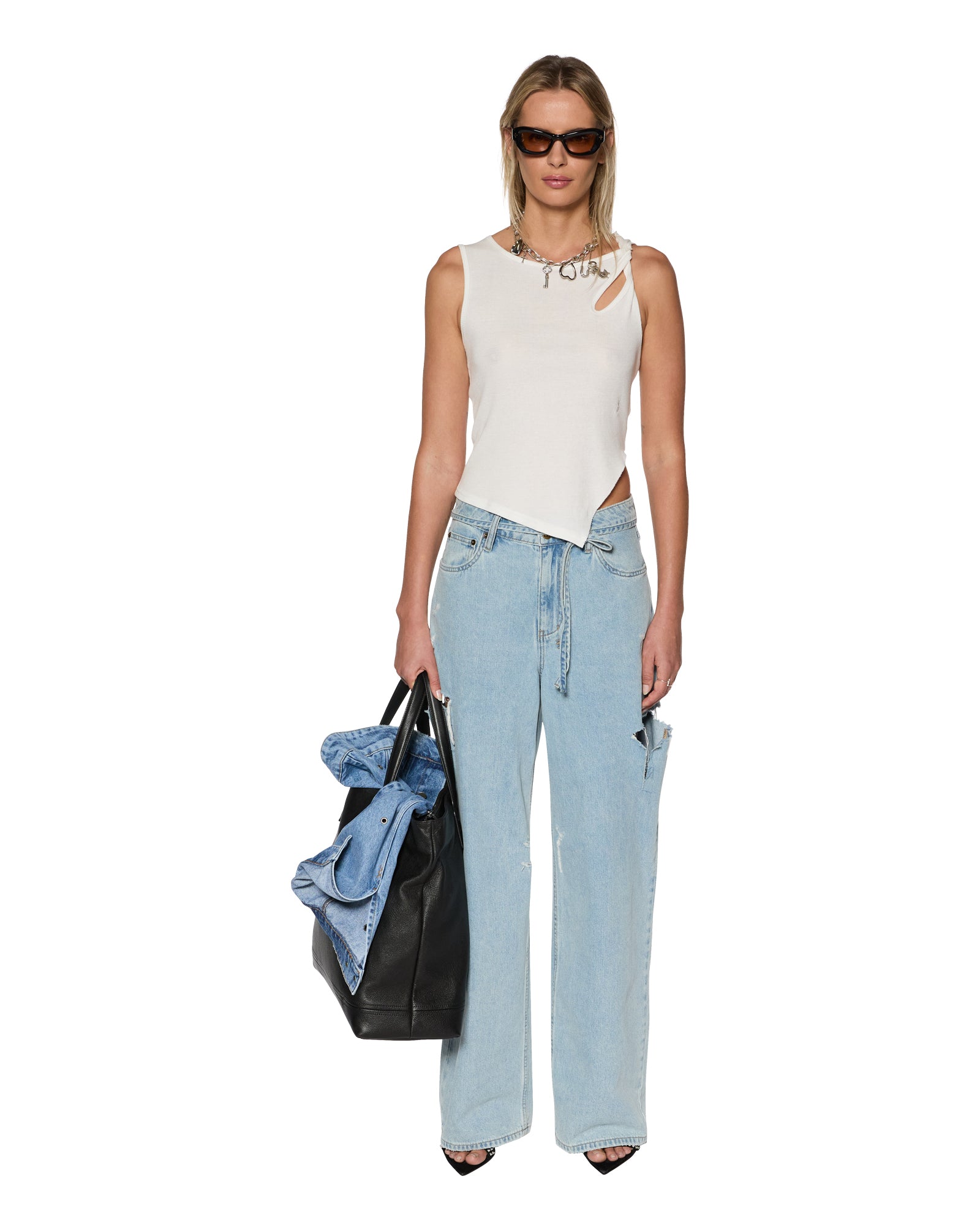 The Twisted Tank White is a full-length tank made from premium lightweight cotton rib in white. It features a unique twisted detail on one shoulder. with a raw cut neckline and side seam split. Branding includes cross dollar and T-box embroidery.
