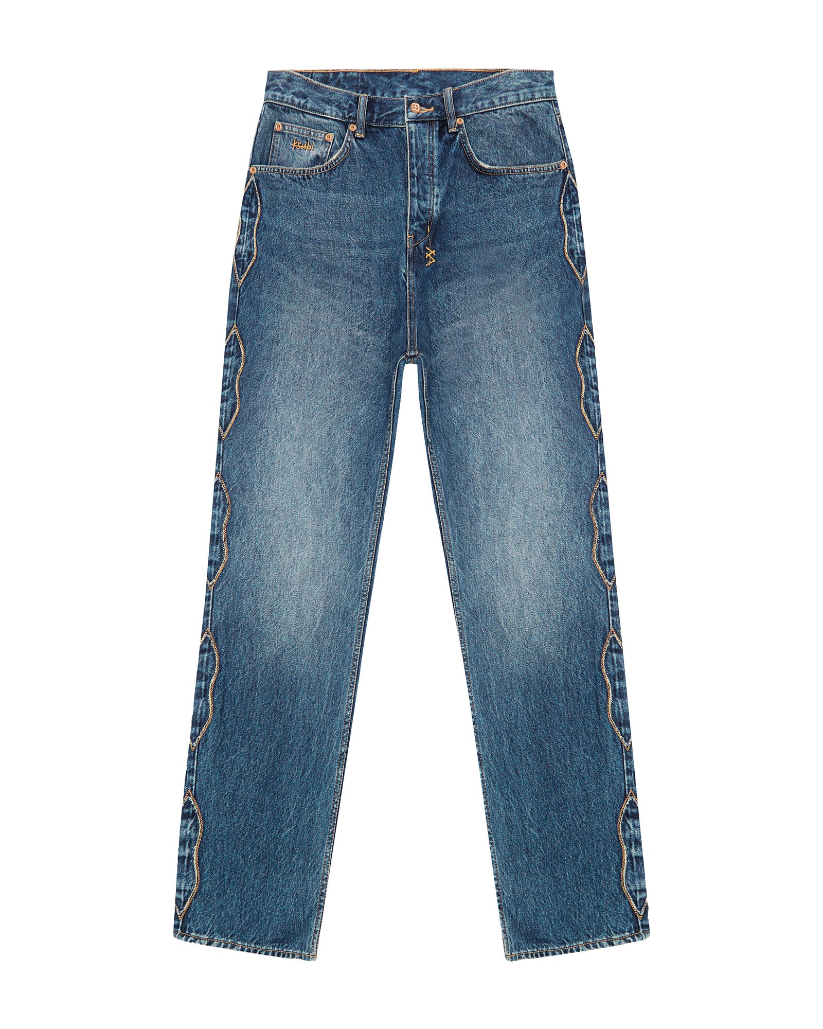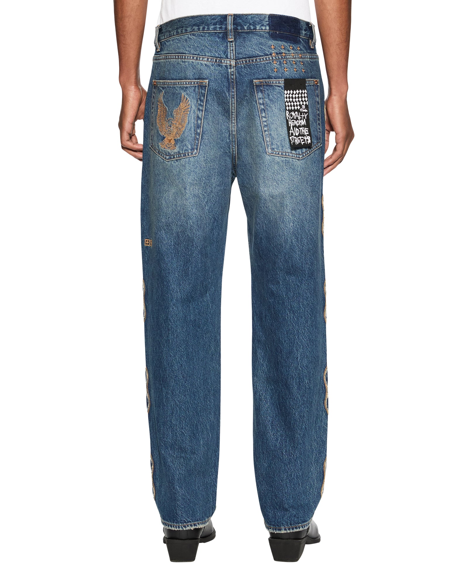 The Anti K Antique Kraft is a mid-rise. relaxed fit jean with a wide straight leg. Crafted from premium rigid denim in a dark indigo wash. featuring raw cut side seam applique details and back pocket eagle embroidery. Finished with tobacco coloured top stitching.