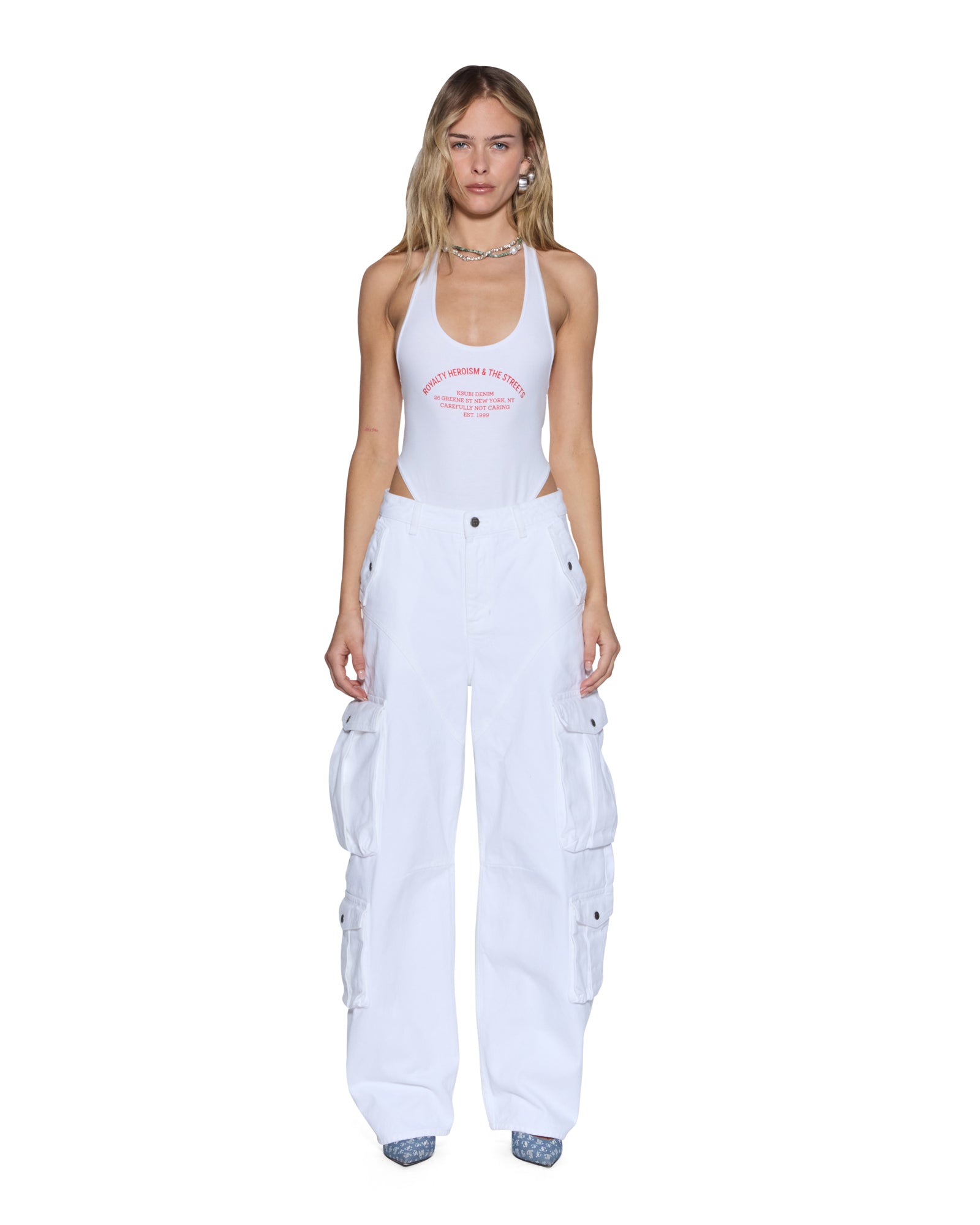 The Barrel Jean Cargo Fresh is a mid-rise. relaxed-fit jean with a distinctive barrel-shaped leg that tapers at the ankle. Made from premium European rigid denim in fresh white with tonal topstitching. it features side-facing 3D cargo pockets. curved western-inspired panel lines on the front and back thighs. Ksubi branded hardware. T-box and 3×4 embroidery. and a removable pocket tag on the wearerÕs right back pocket. designed for a flattering. sculptural silhouette. Style back with the Trucker Vest Fresh for an all-white elevated look.