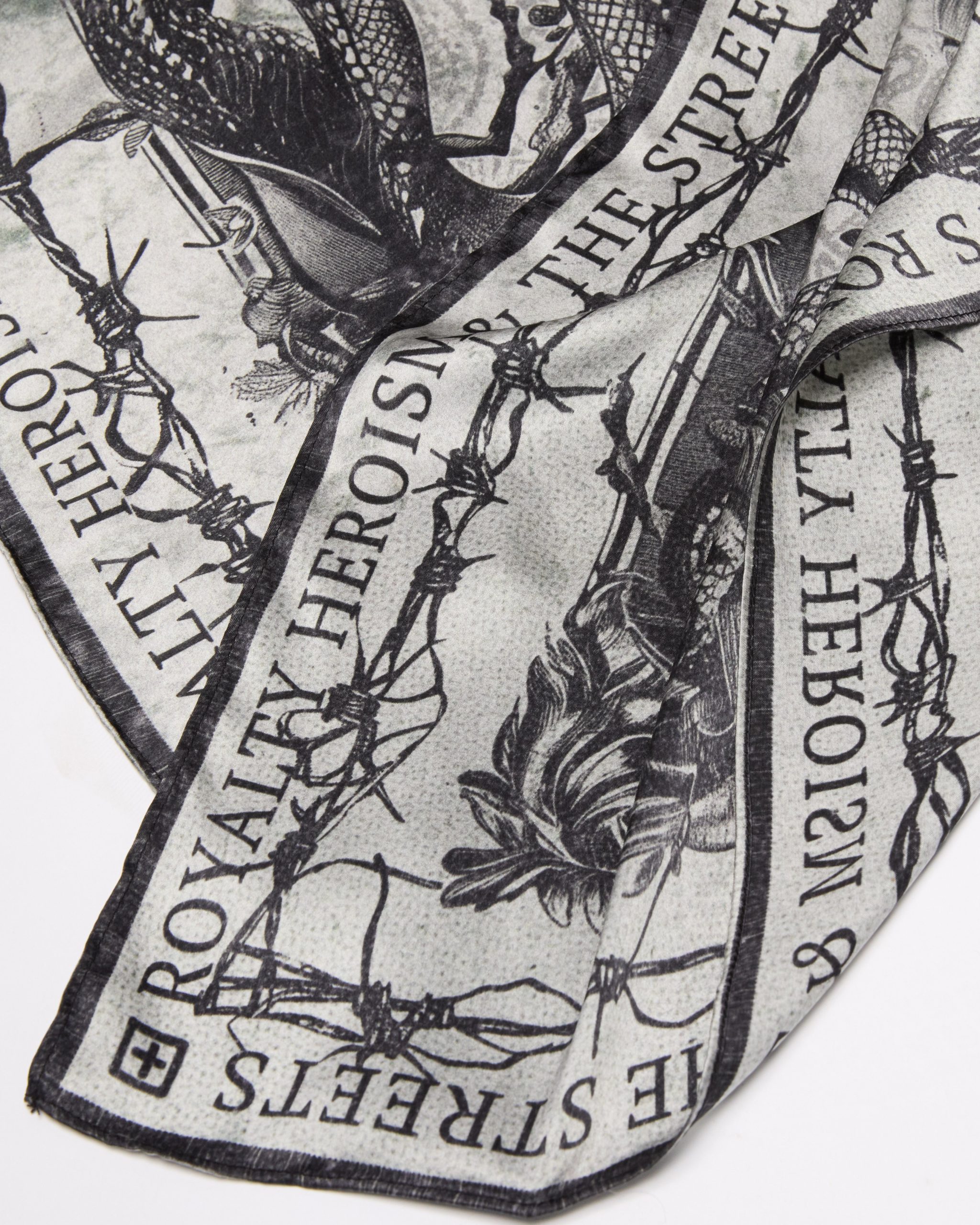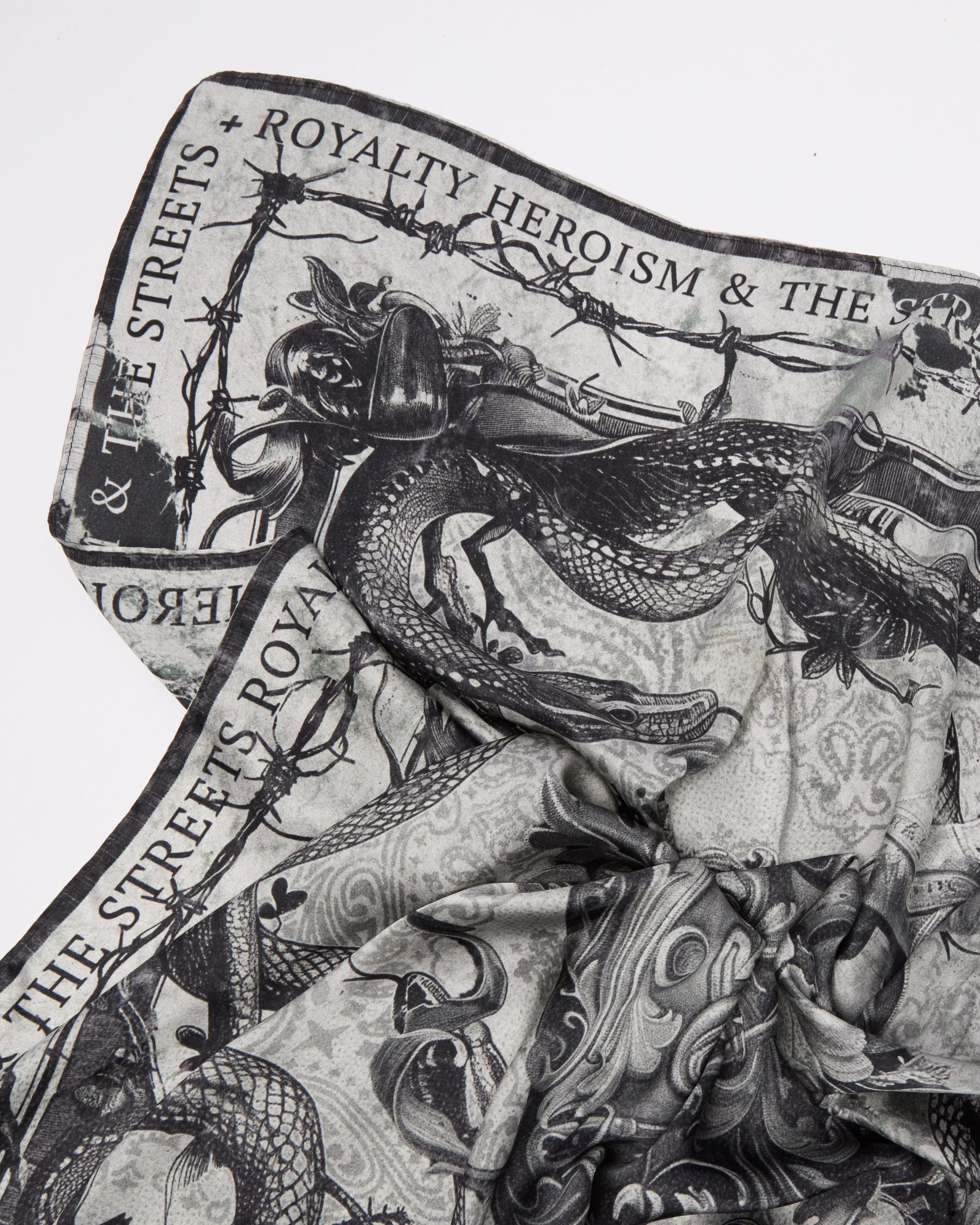 Digitally printed square silk scarf featuring a motif of classic Ksubi iconography and branding. Designed to be worn as a top. printed on 100% silk