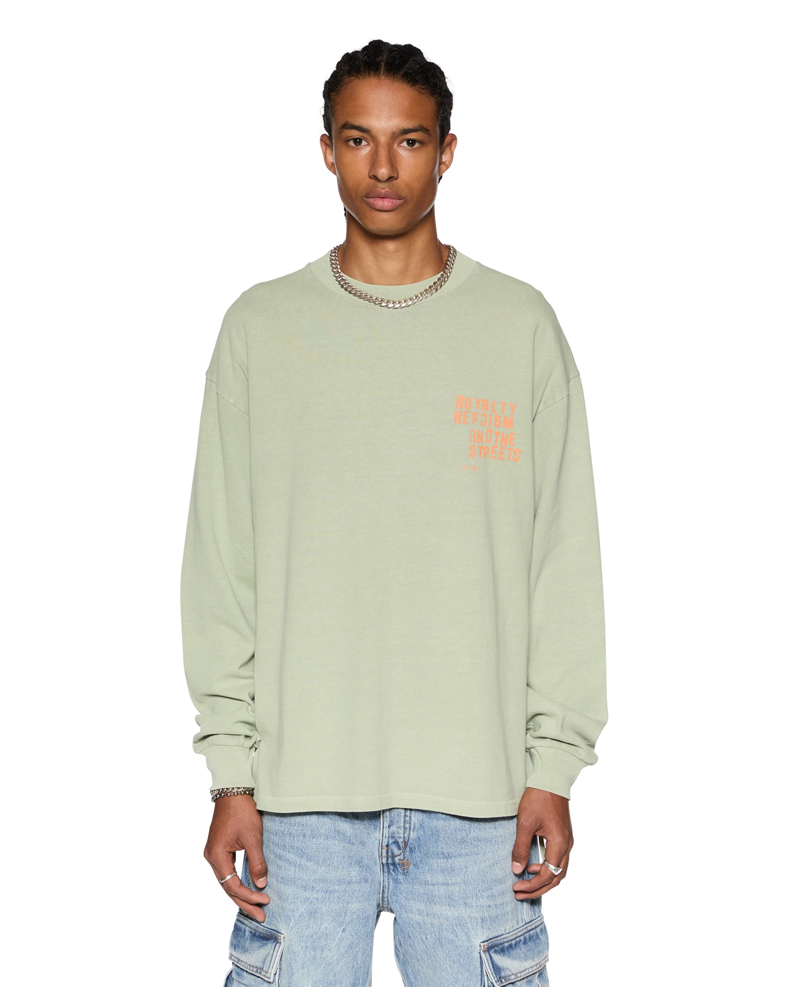 The Hero Ekcess Long Sleeve Tee Grass is a boxy. oversized fitting long sleeve t-shirt with a dropped shoulder and raw cut back hem. Made from premium heavy-weight cotton jersey in overdyed grass green with an aged wash. it features seasonal screen-printed artwork at the front and back. and is finished with T-box and 4×4 embroidery branding.