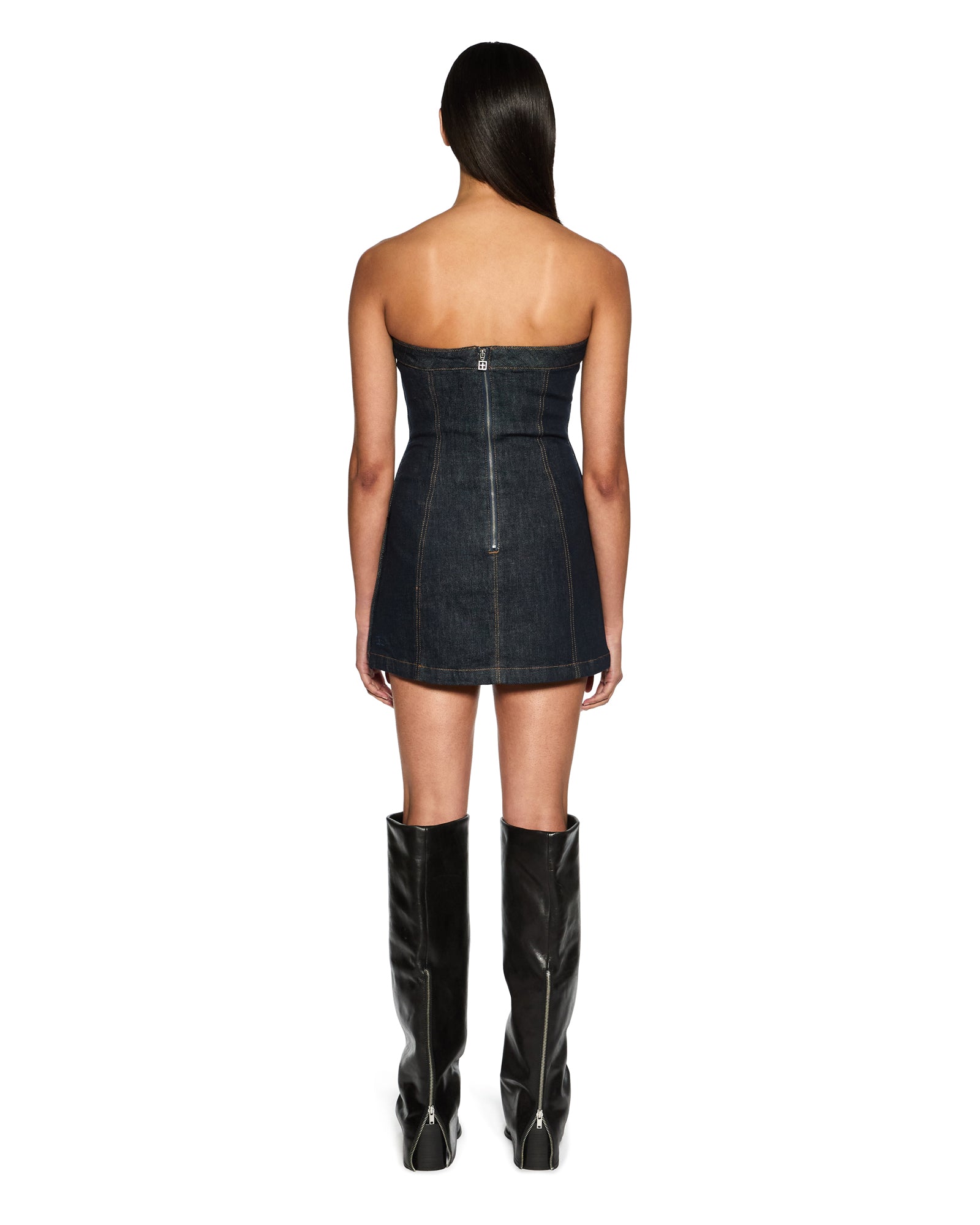 The Hotline Dress Original Snaps is a fitted strapless bustier mini dress. It has an exposed centre back zipper and snaps that open along the side seams. from the hem to the waist. to allow for layering over jeans.