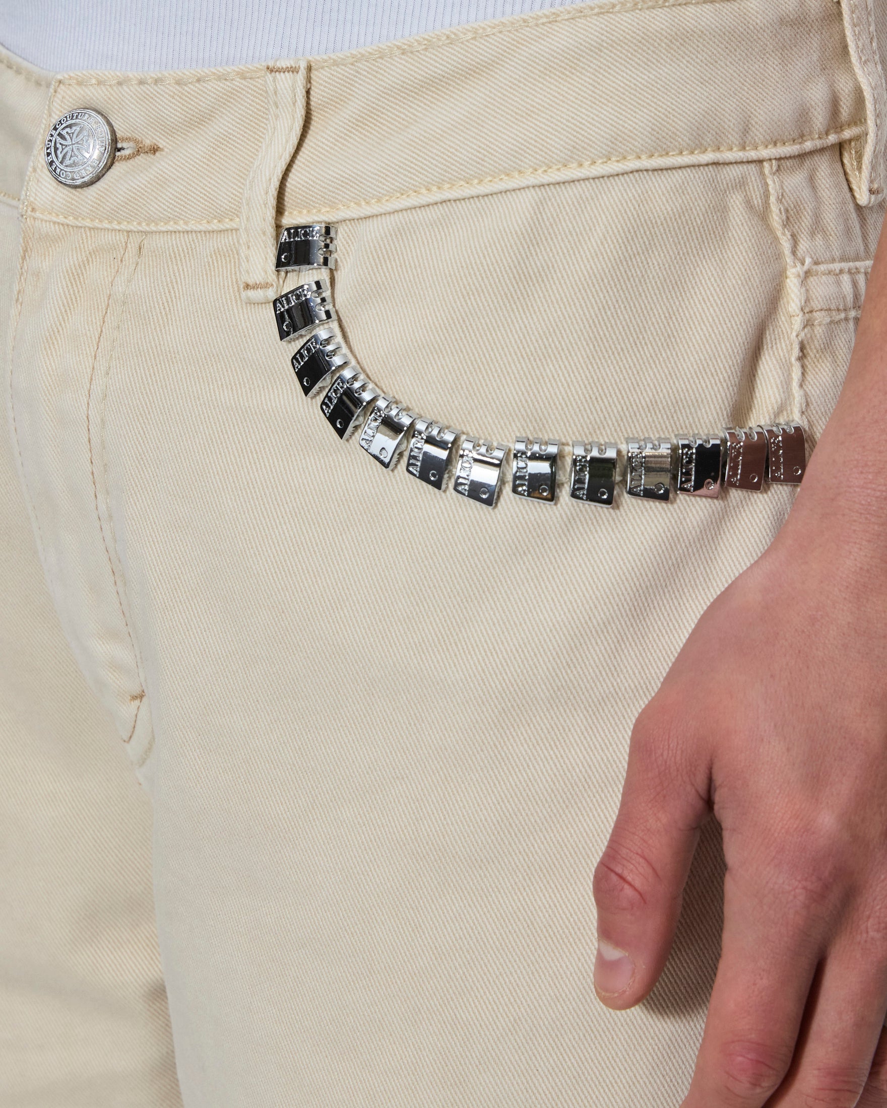 The Toro Ivory is a mid-rise. full-length jean with a relaxed boot-cut leg. crafted from premium rigid denim in a rigid ivory finish. Featuring traditional denim construction. it is elevated with intricately laser-cut leather appliqué’s in sharp graphic shapes framing the pocket edges. Finished with T-box and 4×4 embroidery. a custom Ksubi by Alice Hollywood pocket flag. and branded hardware. this style merges classic denim craftsmanship with bold. collectible detailing.