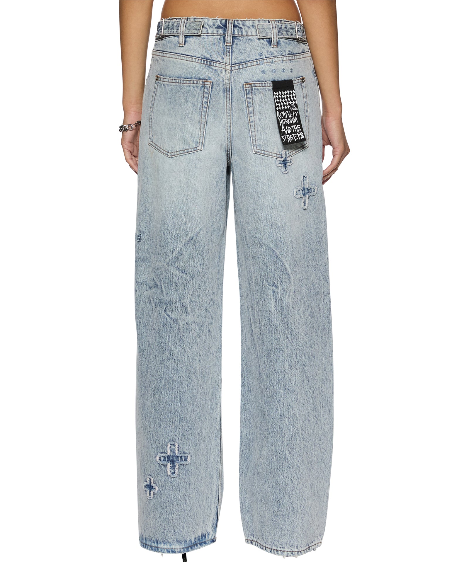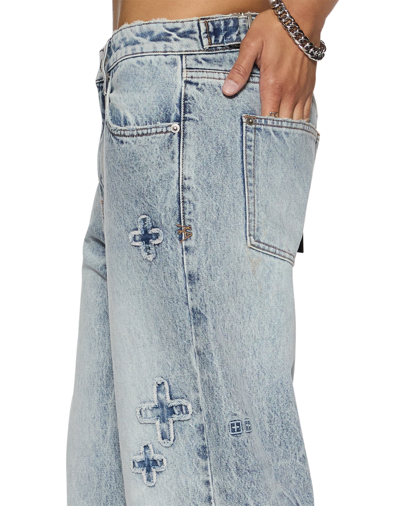 The Low Rider Klassic Kraftwerk is a low-rise. relaxed straight-leg jean with classic five-pocket styling. Crafted from premium rigid denim in indigo blue stonewash. it features Ksubi ‘plus’ applique denim patches on the front and back. along with T-box and 3×4 branding and anti-silver branded hardware. The adjustable waist tabs with branded buckle allow you to customize the fit. whether you prefer a low-rise or higher waist style. Size down for a more polished fit or size up for a relaxed. baggy look. Pair it with the Gigi Bustier Klassic Kraftwerk for a bold double-denim look.
