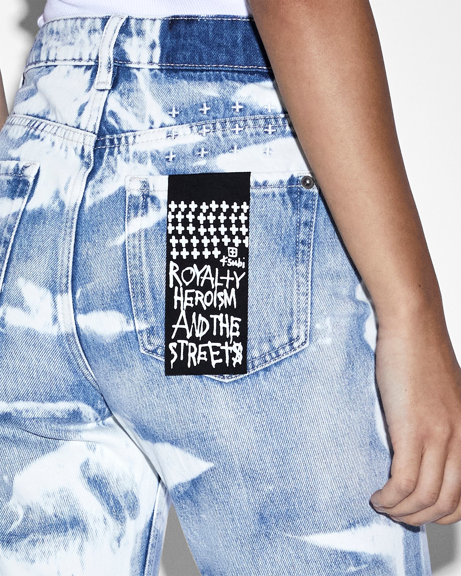 The Nine O Motley is a high waisted. cropped. slim cigarette fit jean featuring a zip fly and classic five pocket detailing. This jean is detailed with the Ksubi t-box print. back cross embroidery. branded hardware and signature woven pocket tag. This style is made from a premium rigid denim with a unique bleached design. Due to the unique wash effect. each garment will vary slightly.