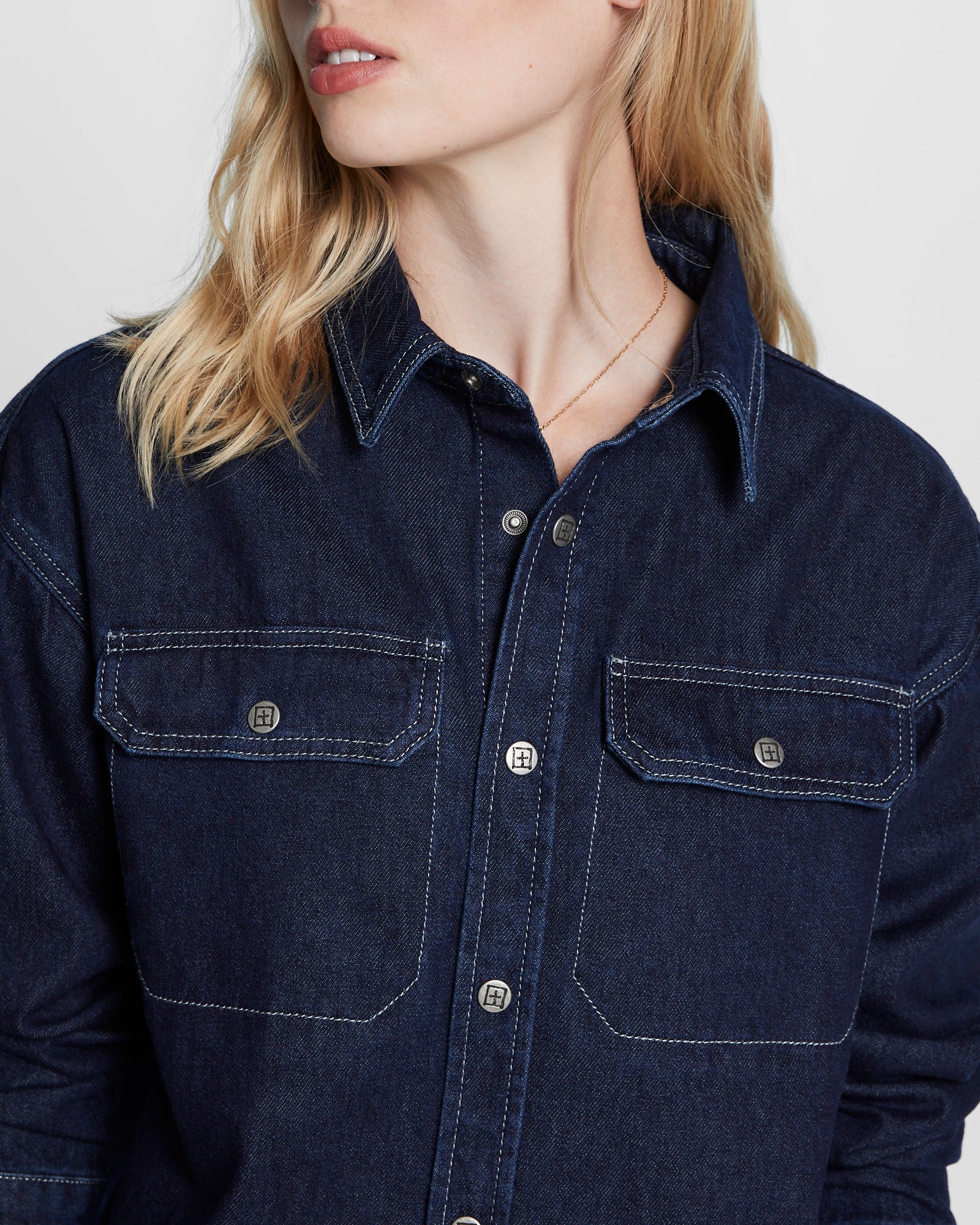 The Relaxo Shirt Moonlight is made from premium European rigid denim in dark indigo with a rinse wash. It is a relaxed fit. button through shirt with collar. full length sleeves and cropped length. It features Ksubi hardware. t-box and back cross embroidery. This shirt is best paired with the ‘Luna Legging Moonlight.’