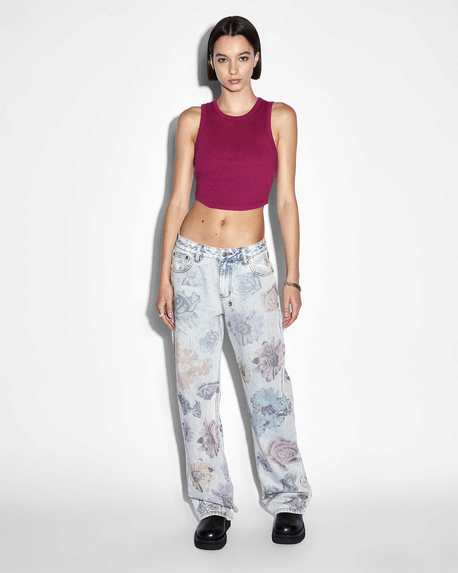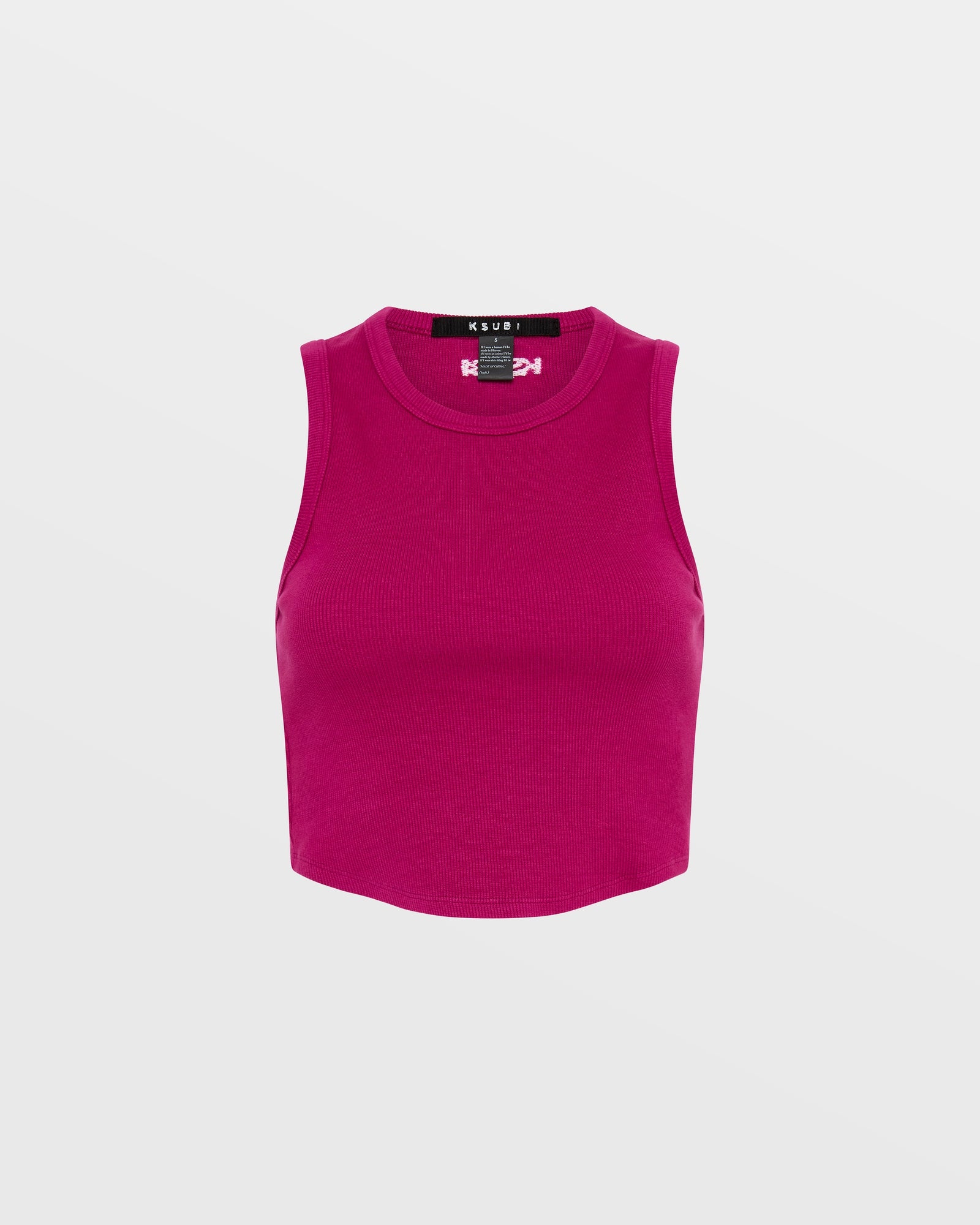 The Syndicate Tank Orchid is a fitted cropped tank made from a premium cotton blend in our custom orchid colourway with a premium hand feel. Designed with a slight racer back detail and curved front hem. this top features tonal Sign of The Times logo embroidery on the back neck. cross dollar embroidery on the front and t-box embroidery on the back hem. Has a a rib that holds you in and is perfect for easy outfitting with any bottom and sits back with our 4 X 4 range.