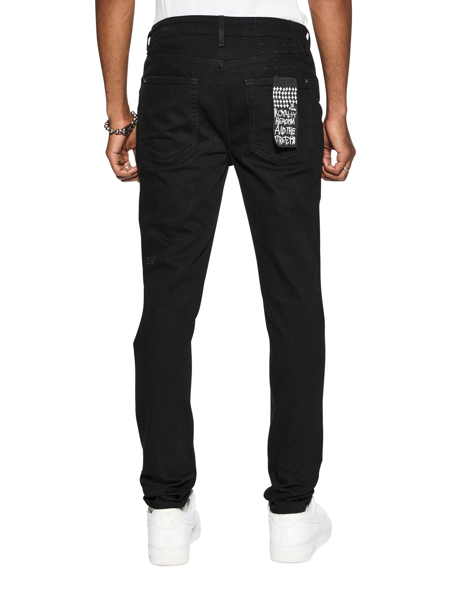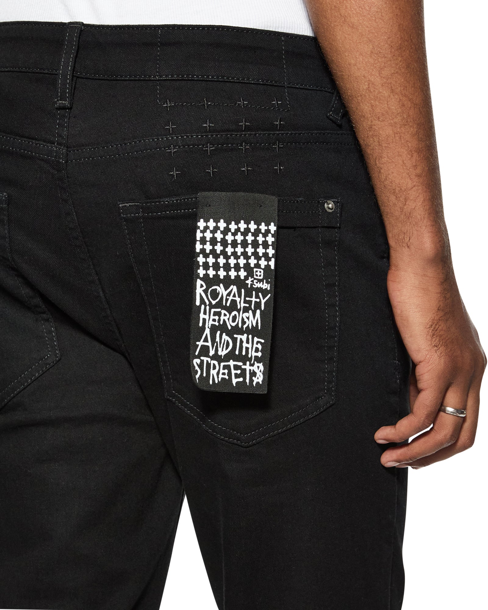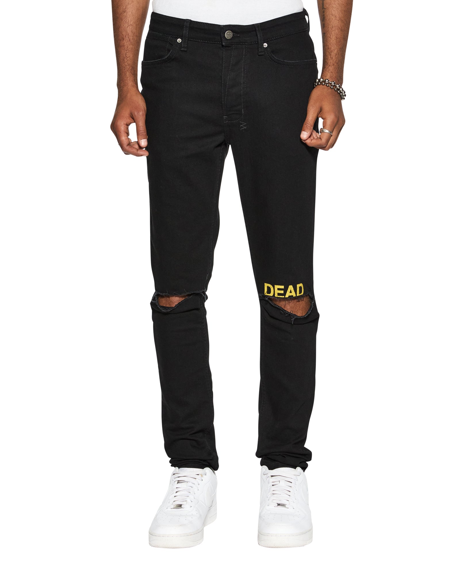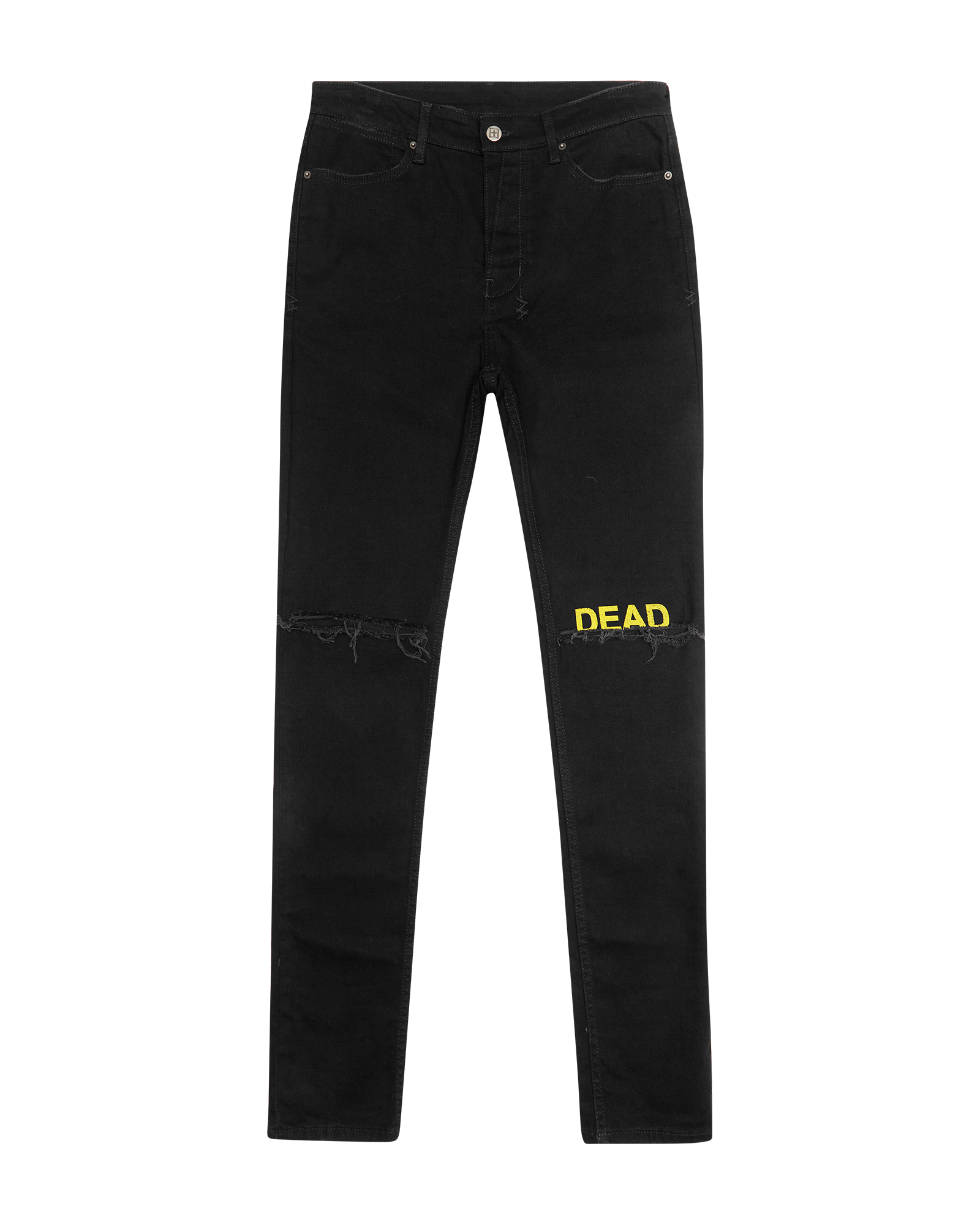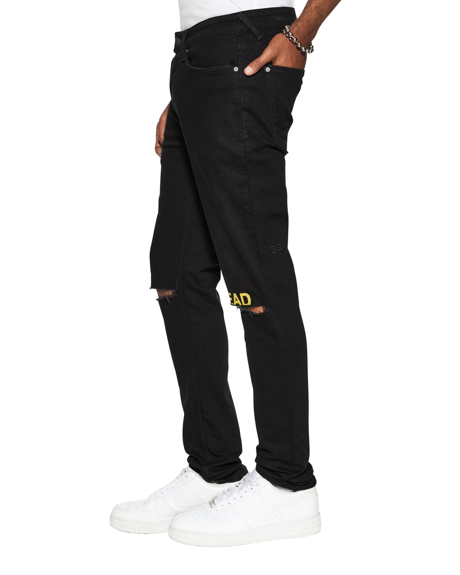 The Van Winkle Laid Black Dead is a mid rise. full-length skinny jean with five-pocket styling. crafted from European comfort stretch black denim with a garment wash. Featuring unique angled belt loops. front fly seam detail. seasonal artwork at the knee. light deconstruction. and is finished with t-box and 4×4 embroidery. ghost patch detailing. and Ksubi branded hardware.