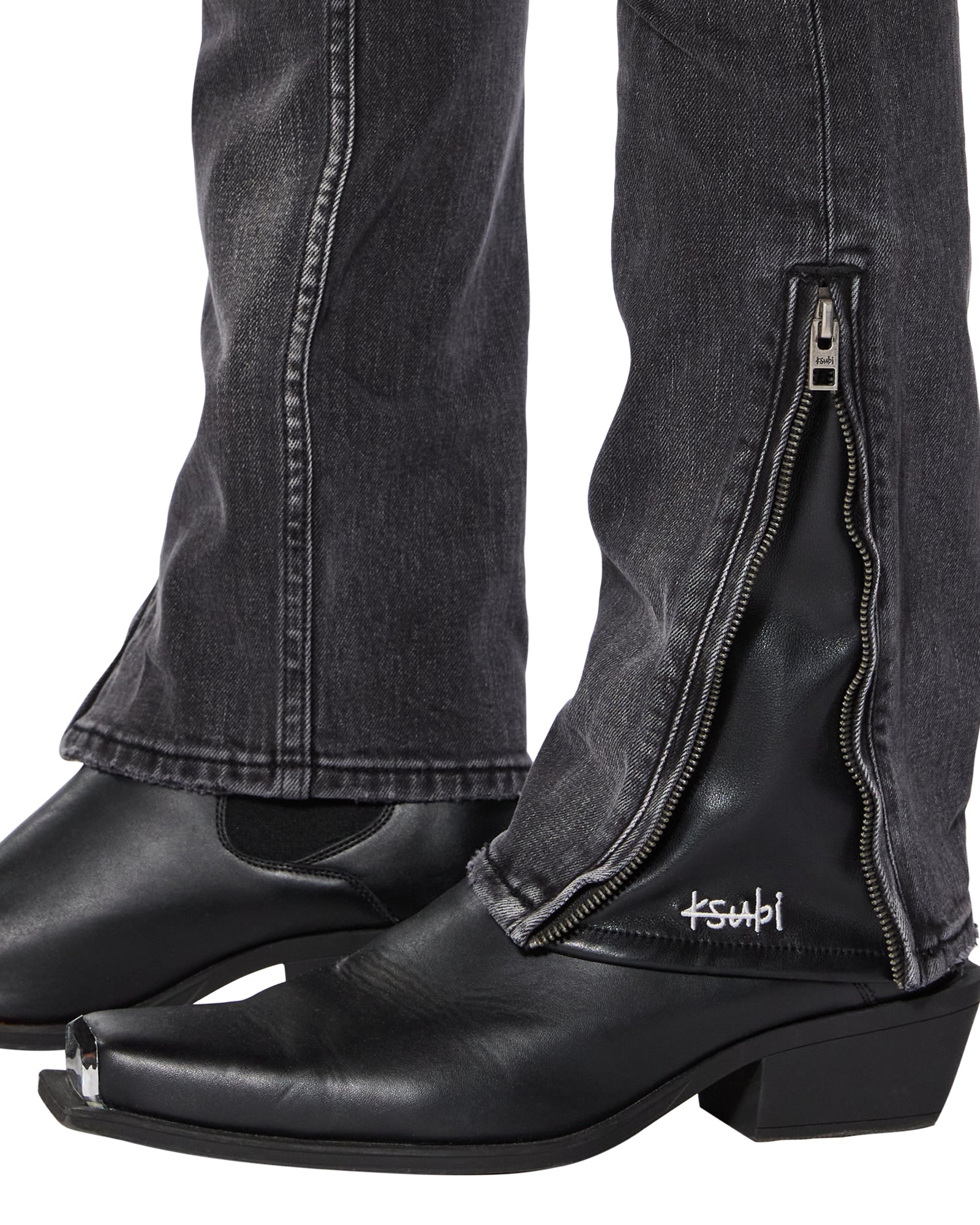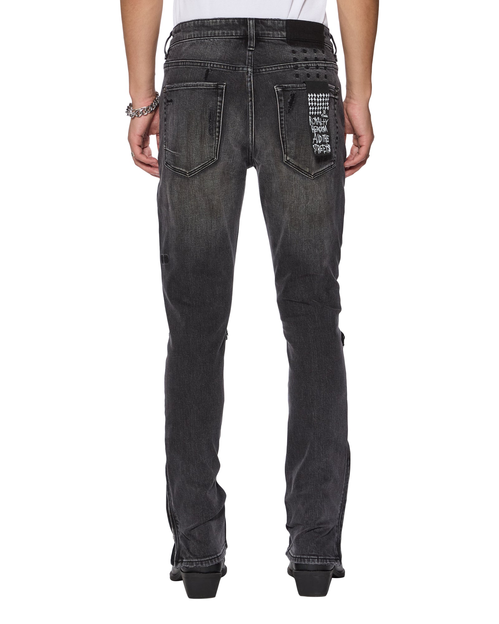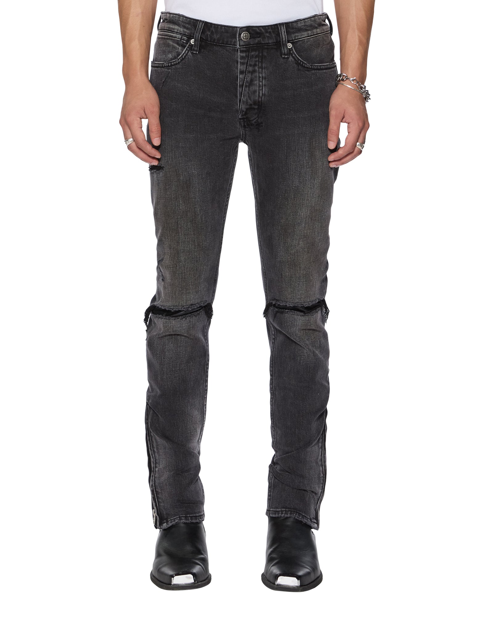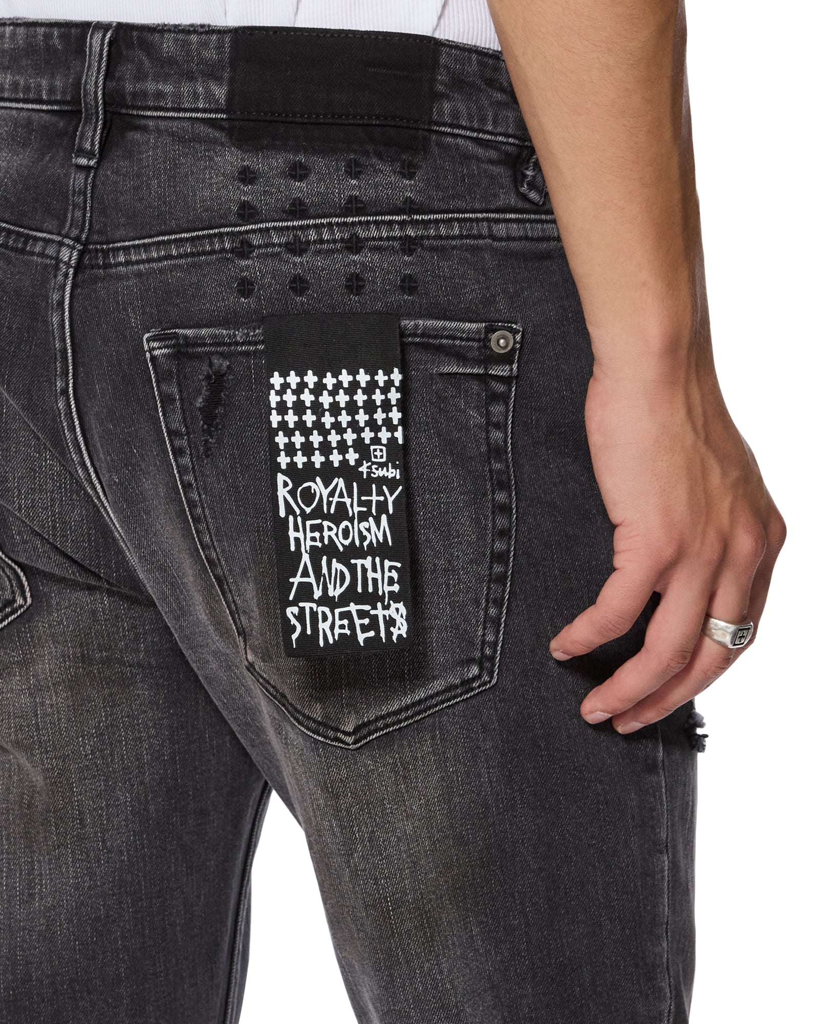 The Van Winkle Torqued Chamber Black is a mid rise five pocket full length skinny jean. Made from premium comfort stretch black denim with a medium stone wash. it is constructed with unique angled belt loops. front fly seam detail. and aging treatments. Features include a side seam zipper gusset cut from a faux leather insert. deconstruction repaired with faux leather inserts. Finished with T-box and 4×4 embroidery. ghost patching detailing. and Ksubi branded hardware.